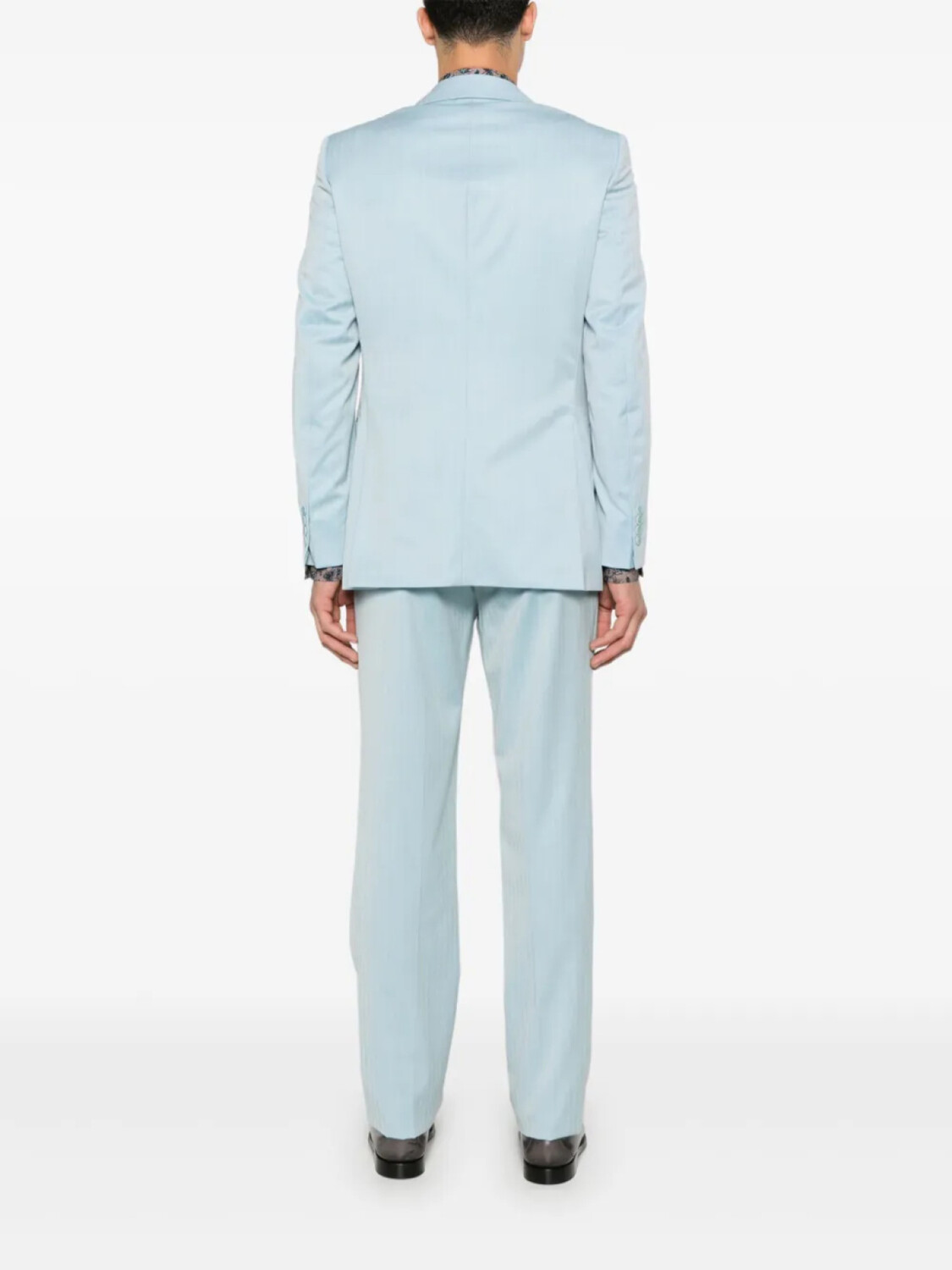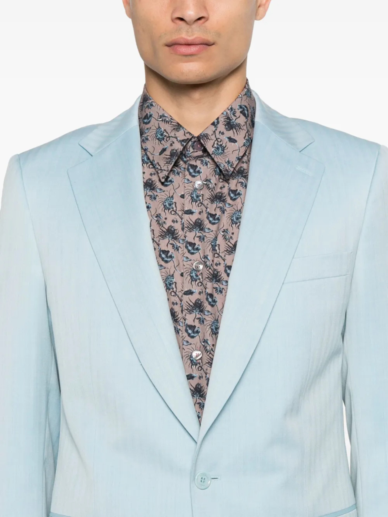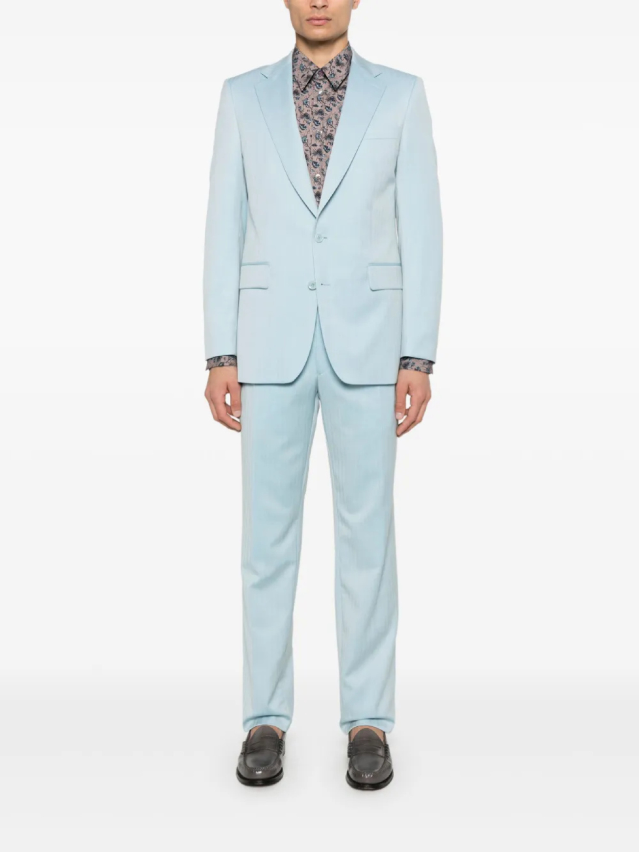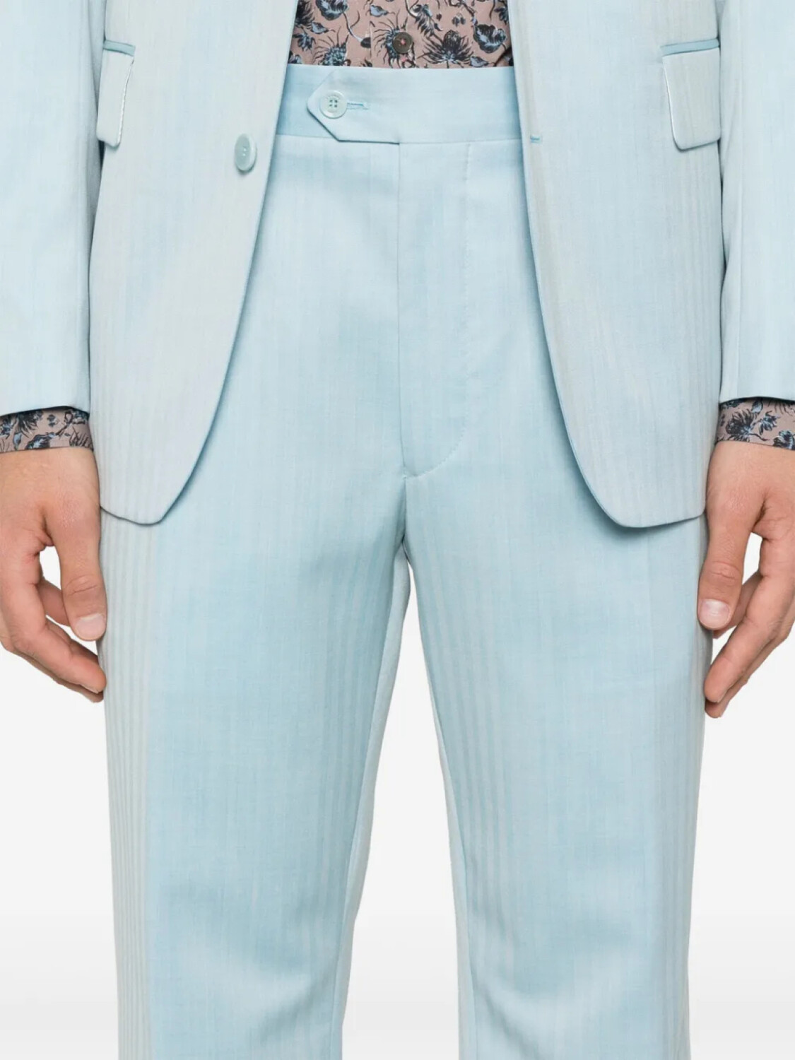Подробнее о товаре: • голубой • вирджинская шерсть • принт в елочку • Пиджак: • застежка на пуговицах спереди • зазубренные лацканы • прорезной карман на груди • подплечники • длинные рукава • манжеты на пуговицах • два кармана с клапанами по бокам • две боковые шлицы сзади • внутренний прорезной карман • цельная подкладка • прямой подол • Брюки: • потайная застежка на пуговицы, крючок и молнию спереди • регулируемые ремешки на поясе • два диагональных кармана по бокам • складки • стрелки • два прорезных кармана на пуговицах сзади • прямой крой