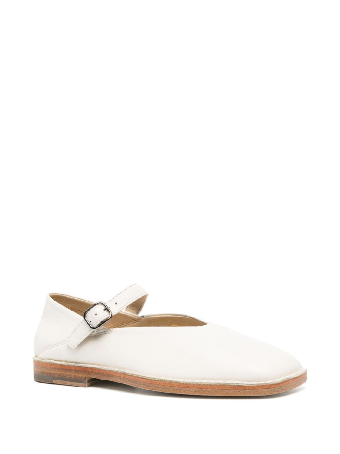 Цвет слоновой кости, телячья кожа, застежка с пряжкой спереди, квадратный носок, стелька с логотипом и наборная подошва.