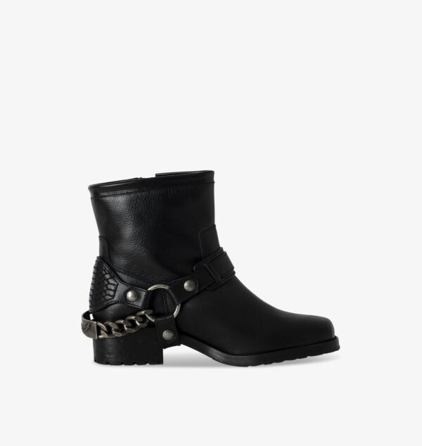 Закрытый квадратный носок, длина до щиколотки, отстрочка спереди, уплотнительное кольцо с ремнями для ремня сбоку, украшение в виде цепочки сзади, украшение в виде металлических крыльев на цепочке, текстурированная панель на пятке