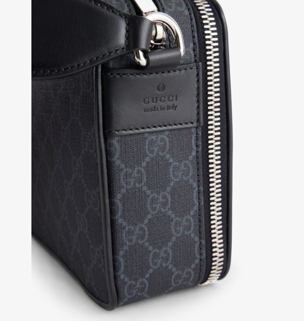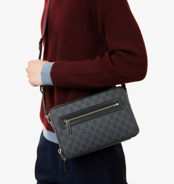 Структурированная форма, регулируемый плечевой ремень из холщовой ткани, монограмма GG по всей поверхности, два отделения на молнии, три внутренних слота для карт, один карман на молнии спереди, кожаная отделка, подкладка