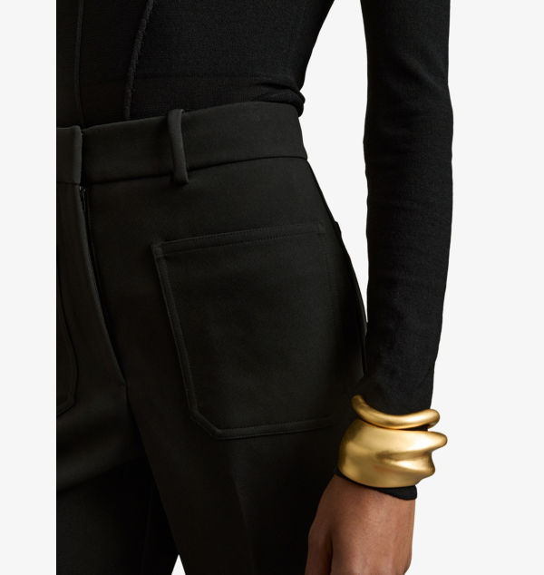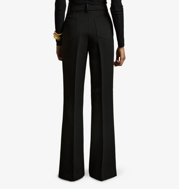 Классический крой, высокая посадка, расклешенные штанины, шлевки для ремня, боковые карманы
