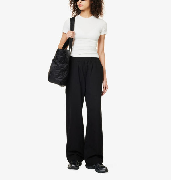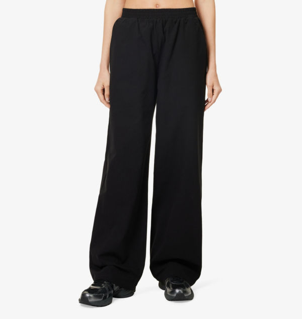 Свободный крой, средняя посадка, широкие штанины, эластичный пояс, накладные карманы спереди, карман сзади