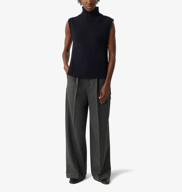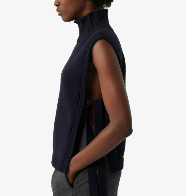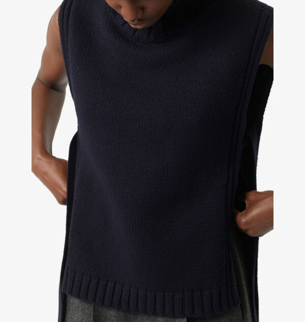 Высокий воротник-труба, без рукавов, детали с мыском по бокам, отделка в рубчик