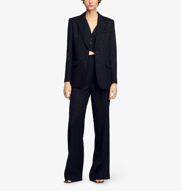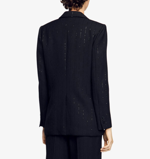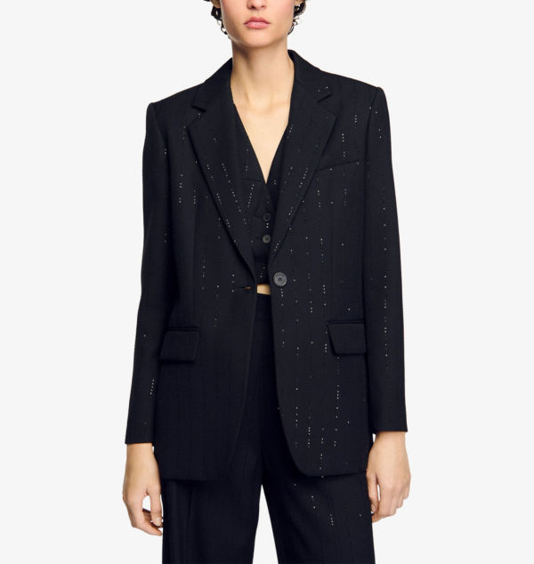 Классический крой, лацканы с зазубринами, длинные рукава, манжеты на пуговицах, прорезные карманы на груди, однобортный, два кармана с клапанами спереди, на подкладке, одна шлица сзади, сплошные полосы с пайетками
