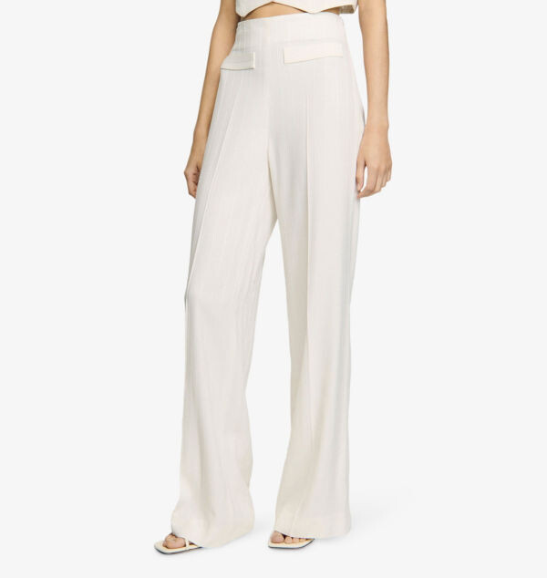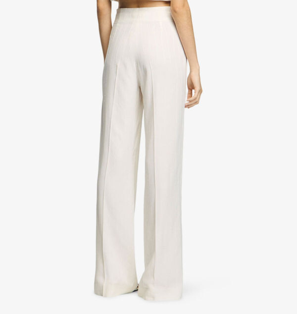 Классический крой, высокая посадка, прямые штанины, структурированный пояс, два передних кармана с клапанами, заутюженные складки, вертикальные полосы и украшения из пайеток в тон