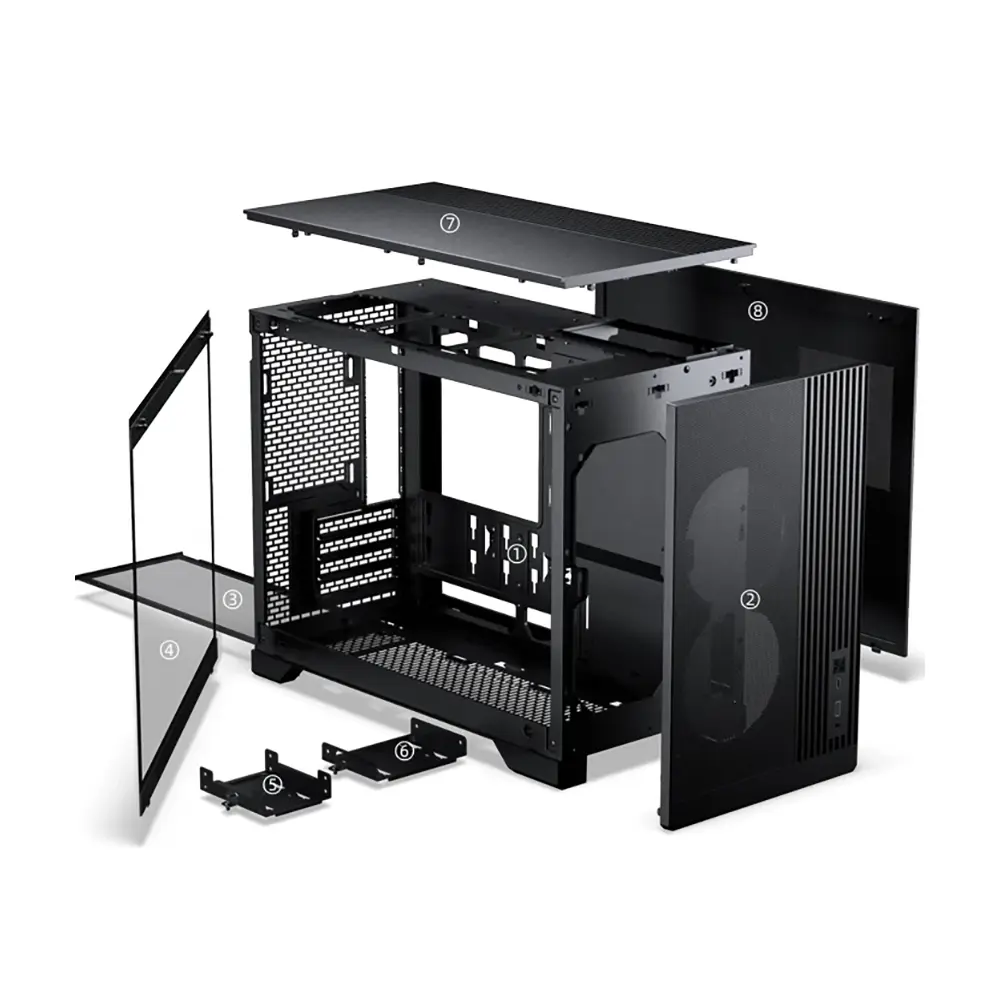 Модульная конструкция корпуса подразумевает установку блока пинания сверху за передней панелью и поддерживает материнские платы с обратным подключением. В месте расположения блока питания на правой панели есть воздухозаборник и отверстие для охлаждения, а нижняя часть оснащена выдвижной пылезащитной сеткой, и в стандартную комплектацию входит кронштейн для видеокарты.