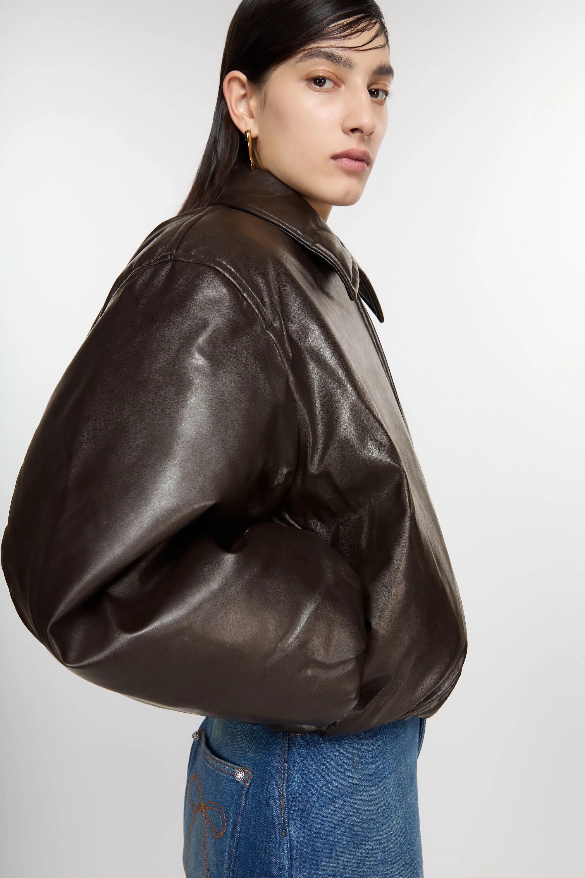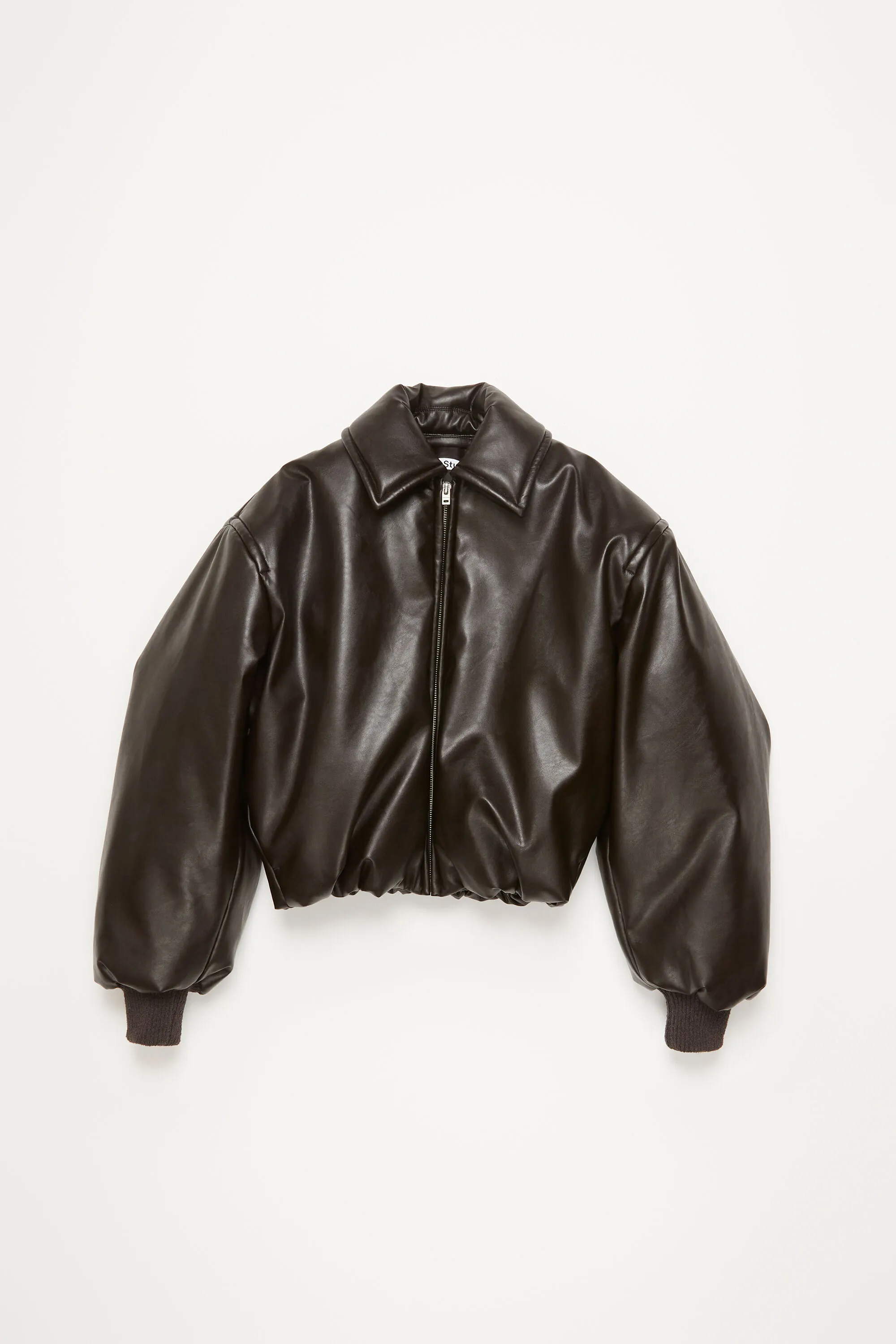 Куртка-бомбер имеет кожаную отделку с покрытием, застежку на молнию, боковые карманы и нашивку с логотипом Acne Studios на спине. Обрезка свободного кроя со спущенными плечами и длиной бедер.