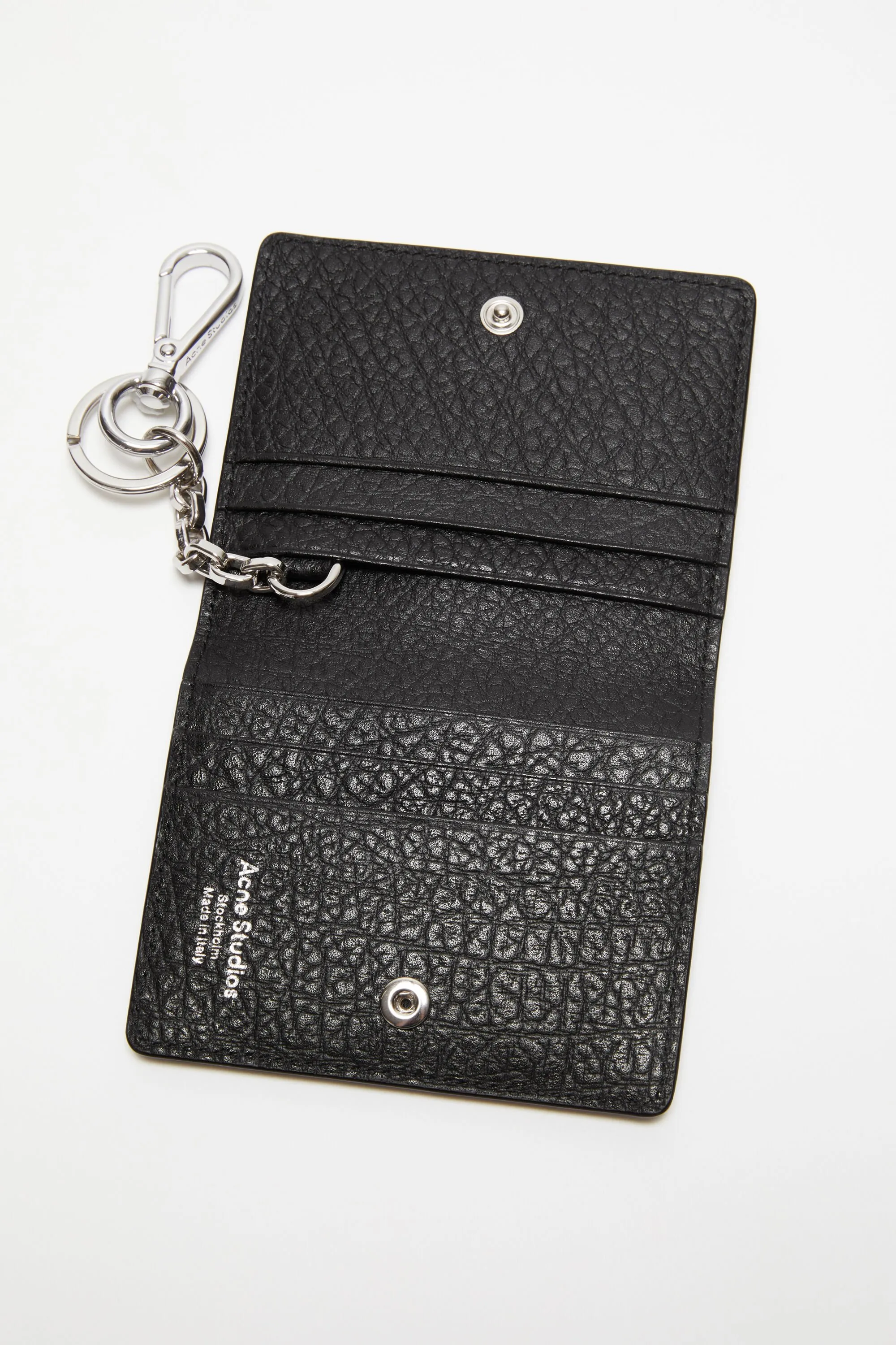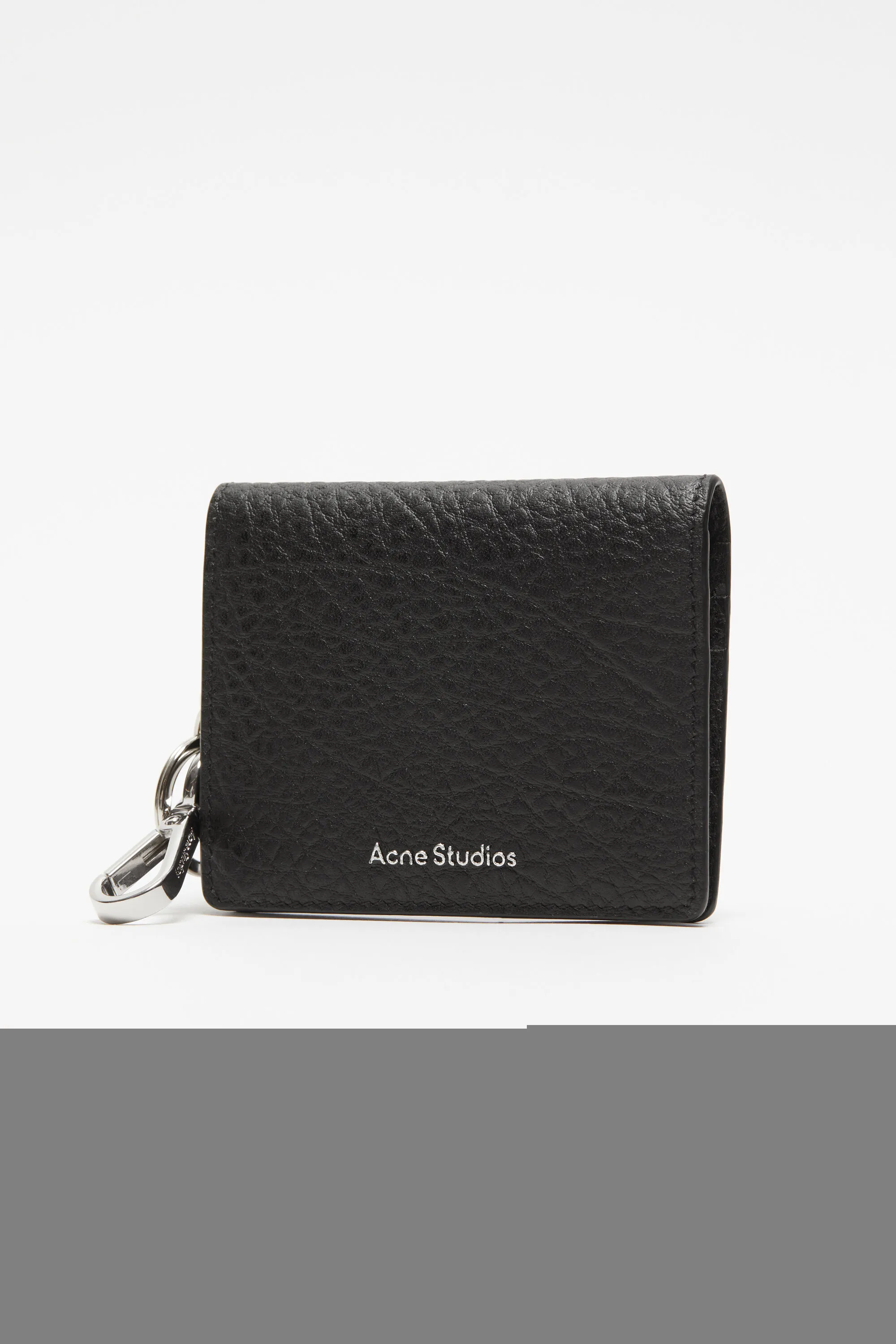 Кошелек-держатель для карт имеет складчатое отверстие с застежкой на кнопку, изготовленное из зернистой кожи и украшенное логотипом Acne Studios. В комплекте с внутренними отделениями для держателя карт, цепочкой, зажимом и креплением для кольца.