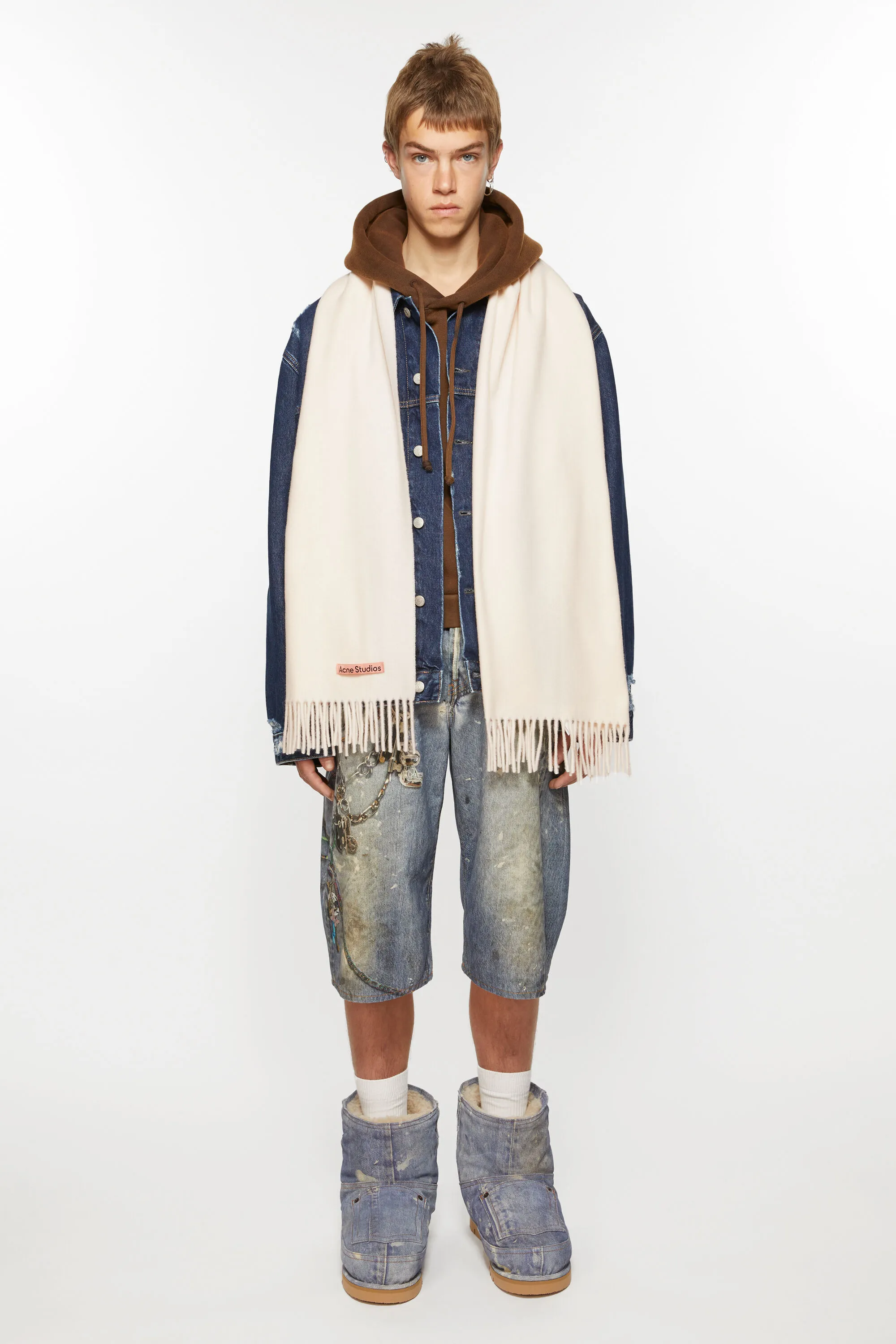 Шарф с бахромой изготовлен из шерсти среднего веса с мягким на ощупь покрытием и украшен розовой этикеткой Acne Studios.