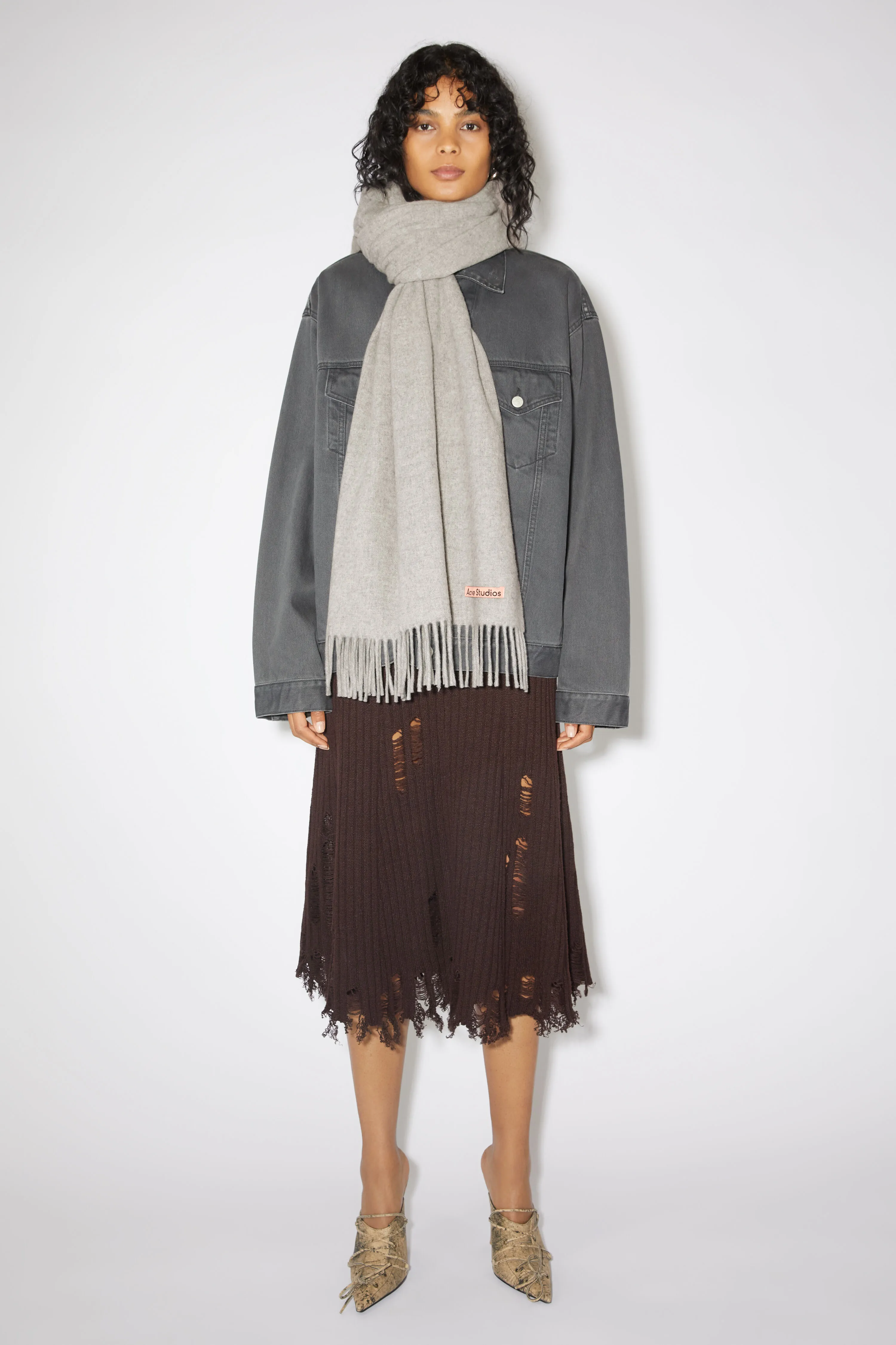 Светло-серый меланжевый шарф Acne Studios с бахромой украшен розовой этикеткой Acne Studios и изготовлен из шерсти среднего веса.