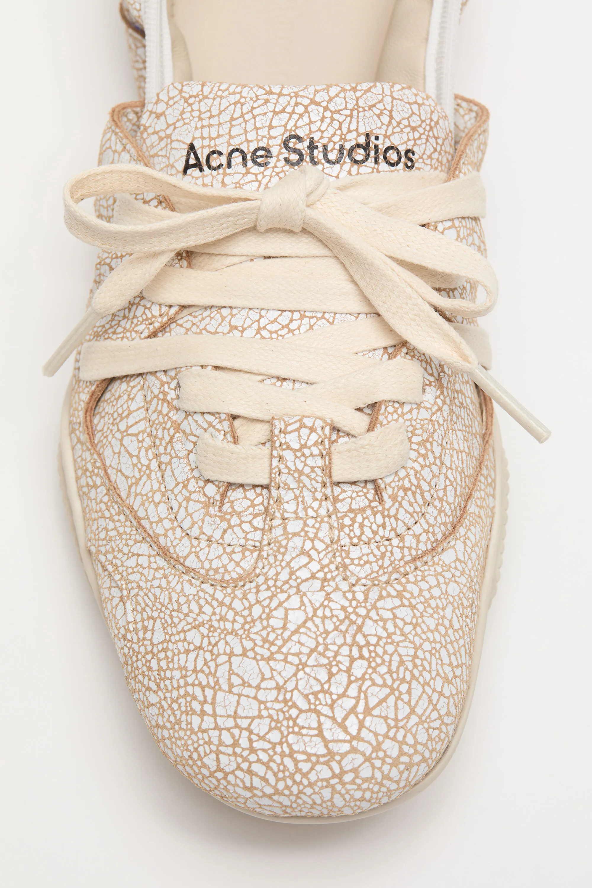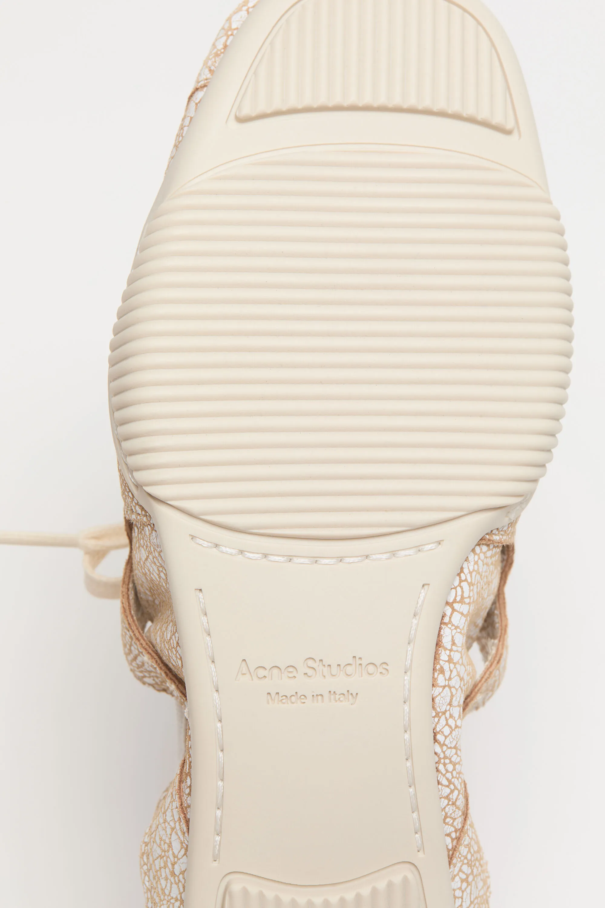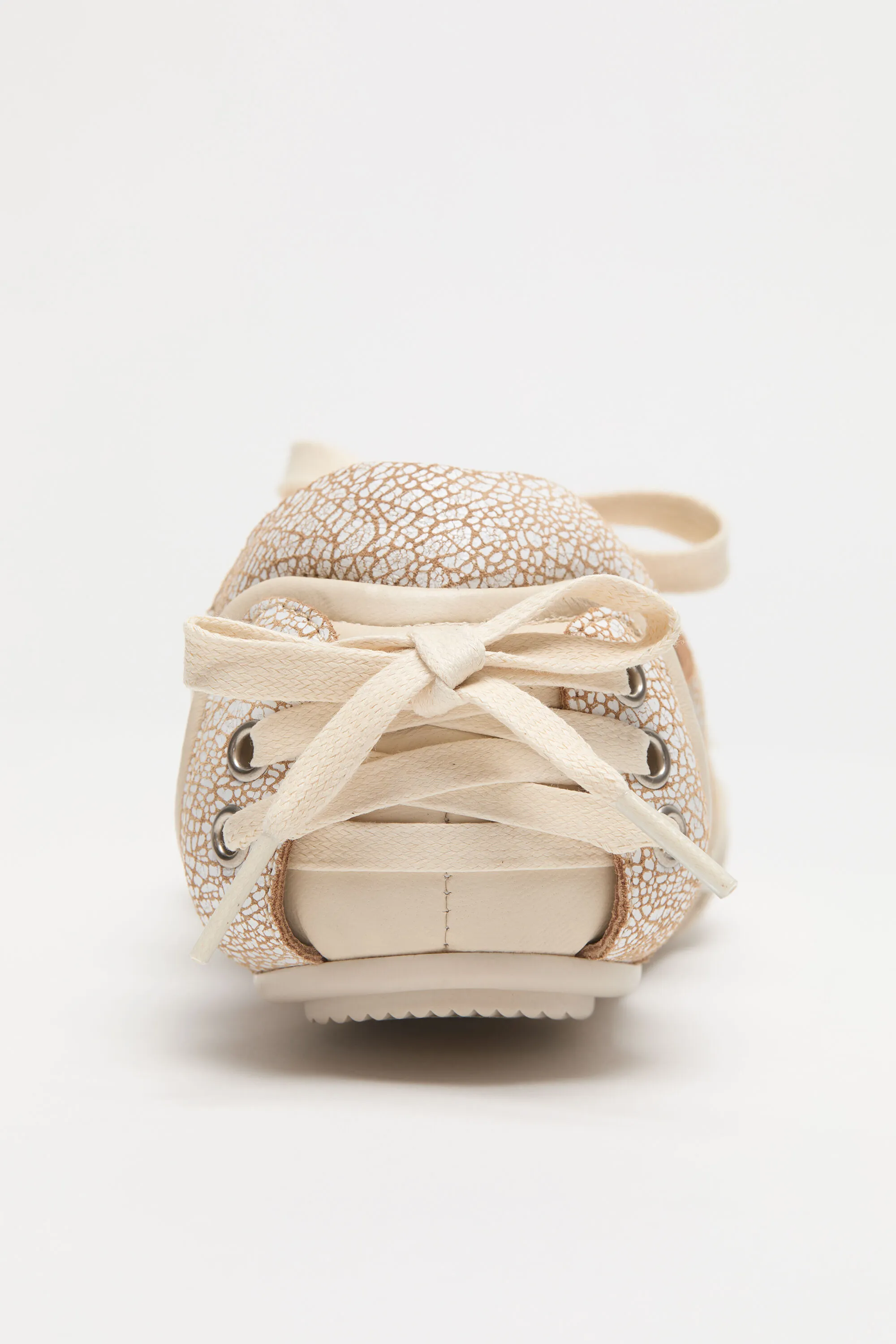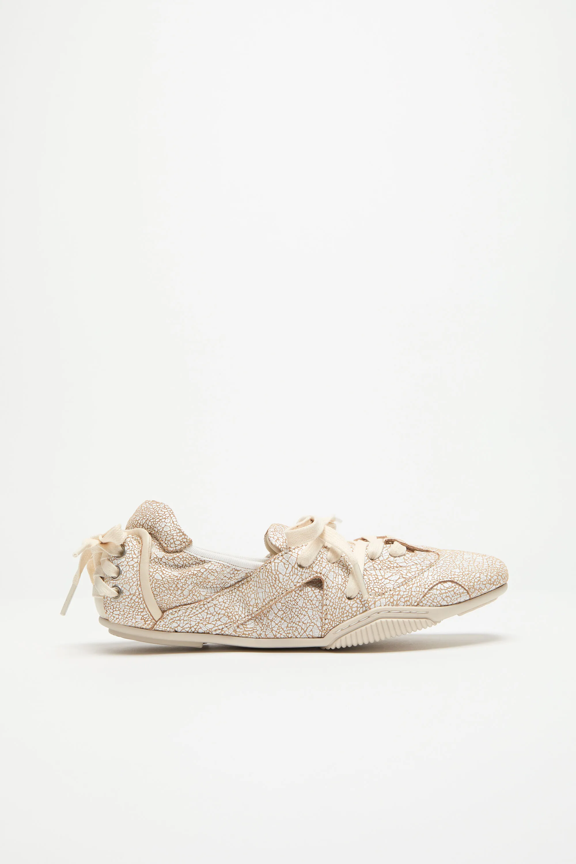 Обувь на шнуровке воссоздает силуэт балерины из кожи с треснувшей отделкой, детализированной декоративной шнуровкой сзади и бесшовной резиновой подошвой.