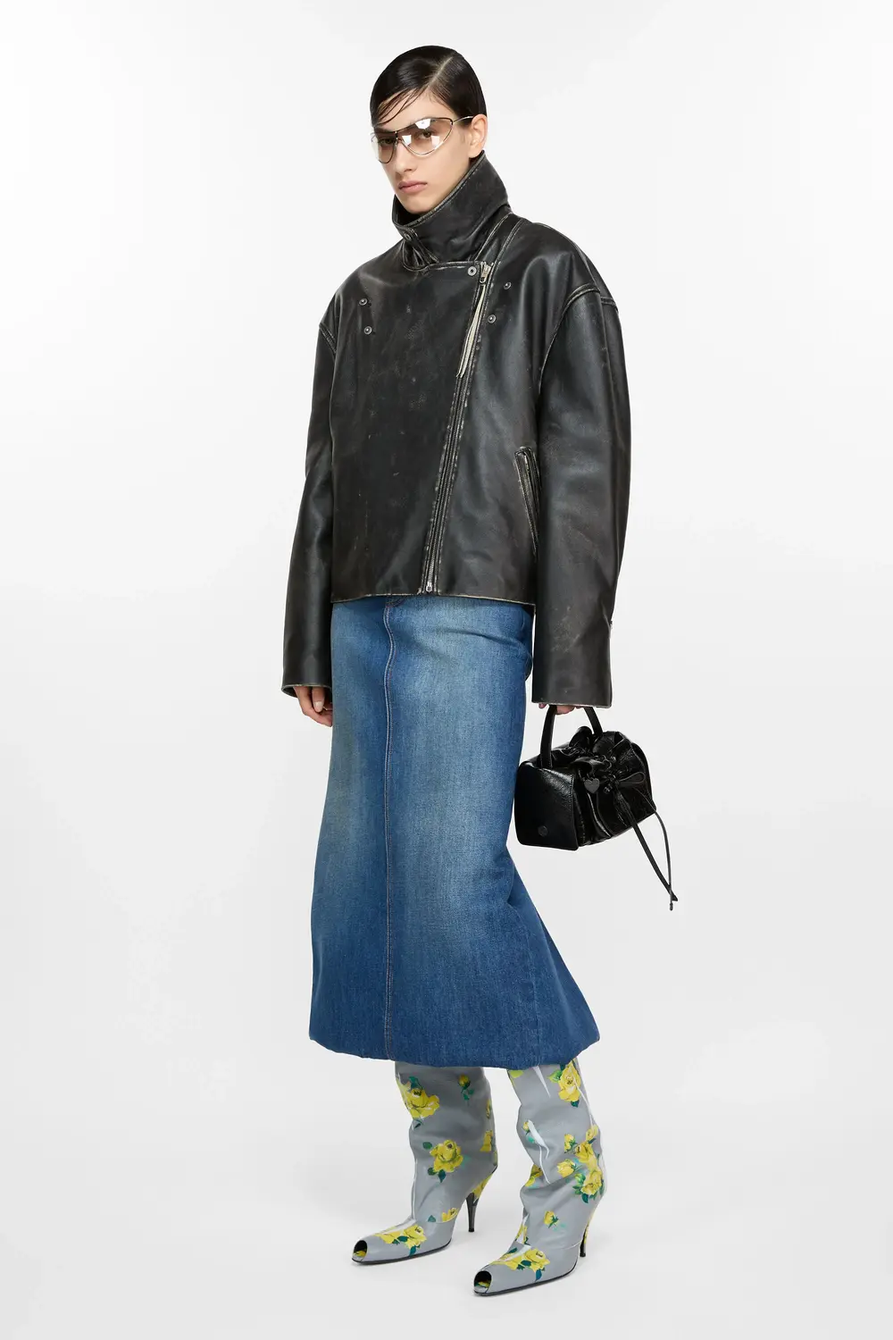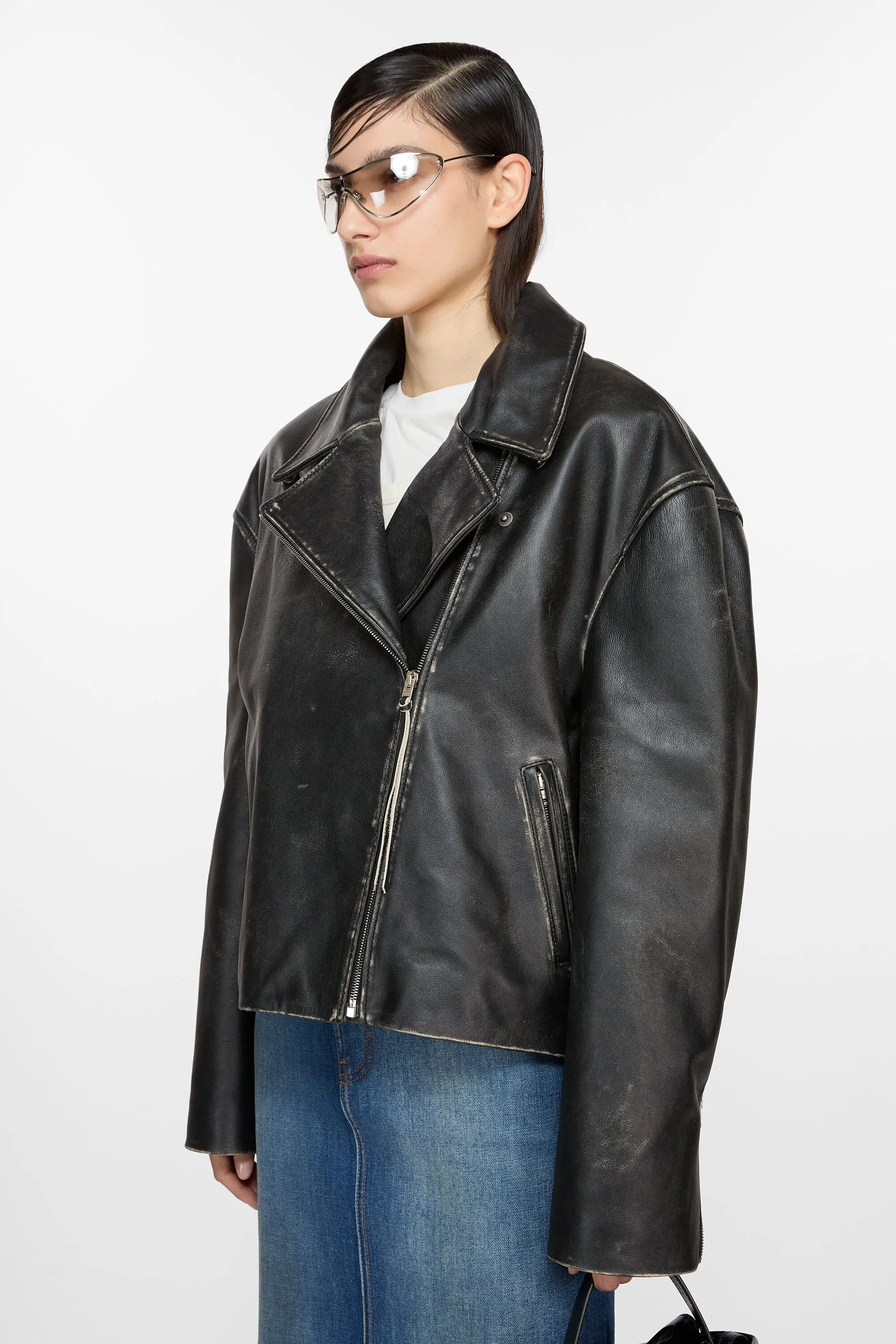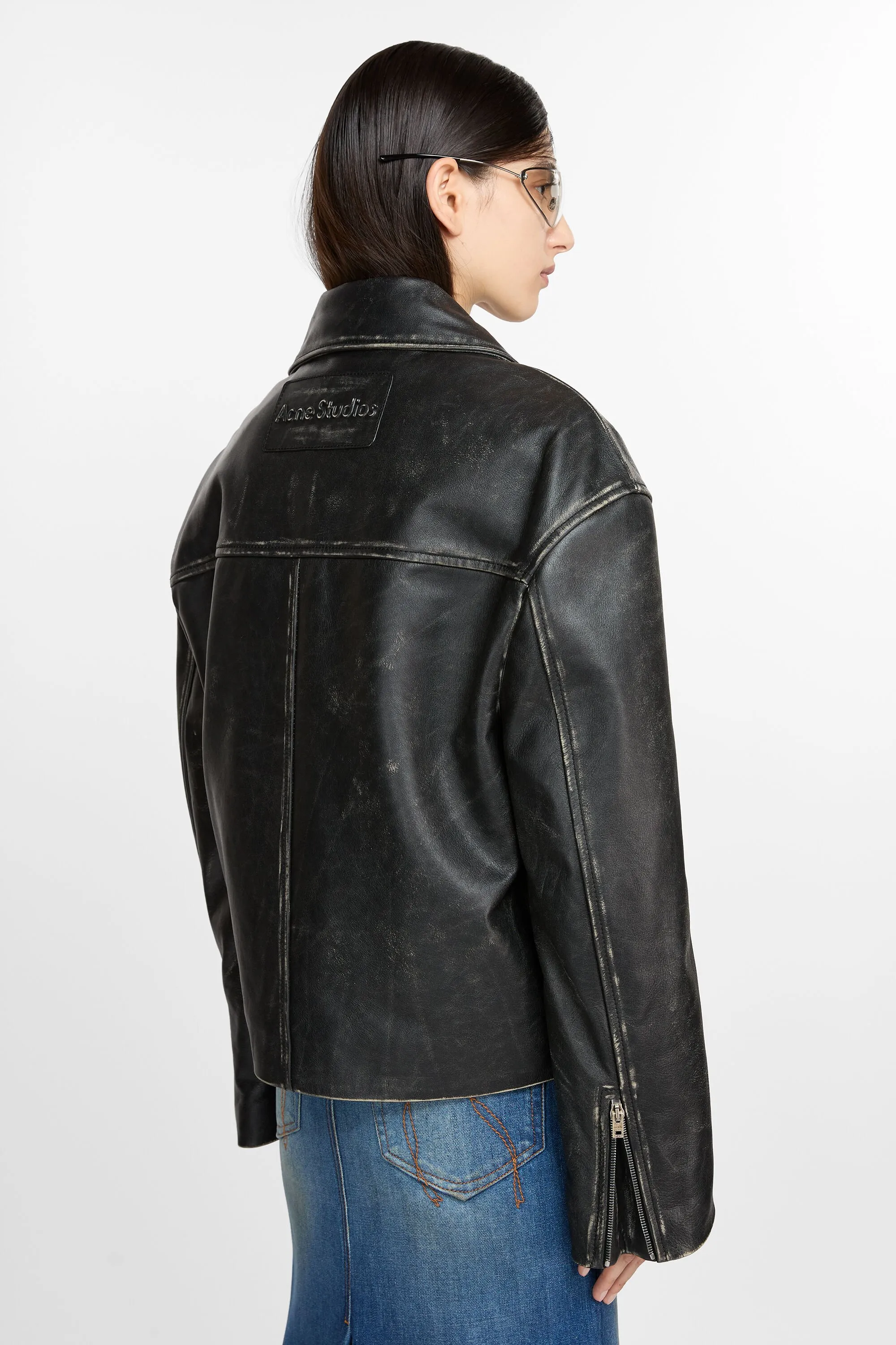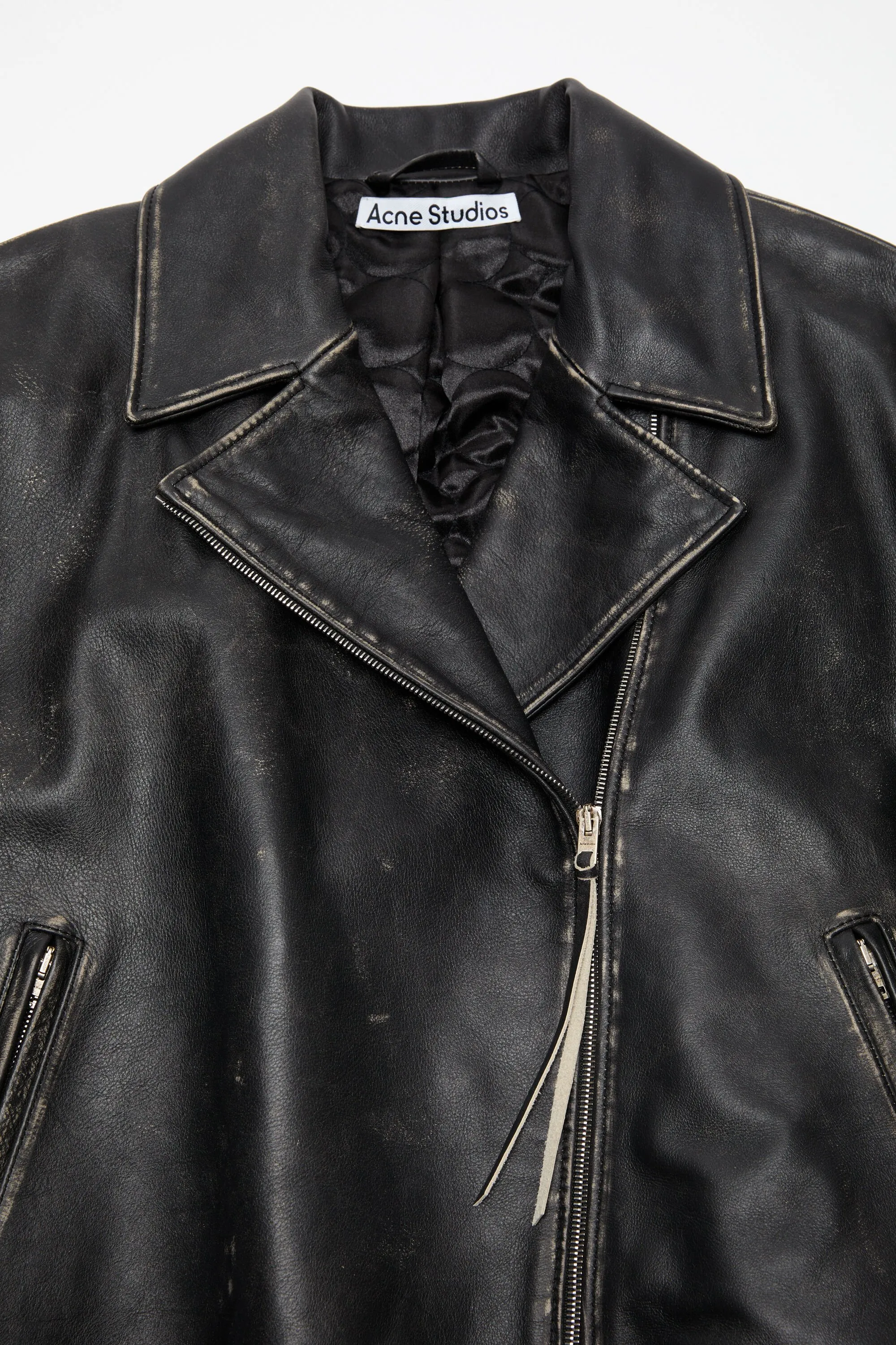 Черная двубортная куртка Acne Studios выполнена в байкерском стиле с легкой набивкой, выполнена из кожи с ручными деталями и эффектом росписи. В комплекте с застежкой на молнию и боковыми карманами для струи. Обрезайте до свободного кроя и правильной длины.