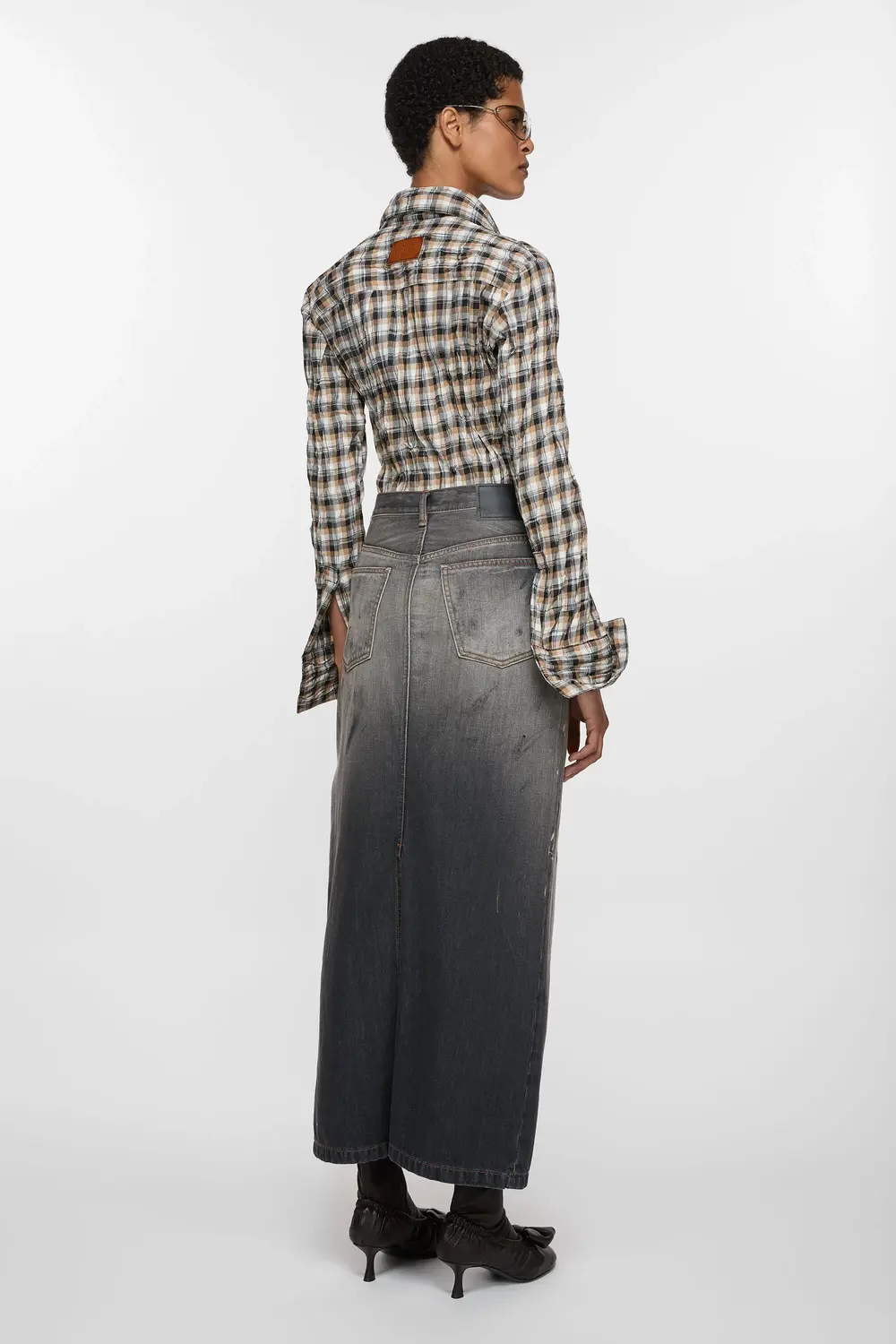 Джинсовая юбка имеет конструкцию с 5 карманами и разрезом по центру спины. Выполнен из неэластичного денима в темном цвете с тонированными и окрашенными деталями со знаками. Крой по стандартному крою со средней талией и большой длиной.
