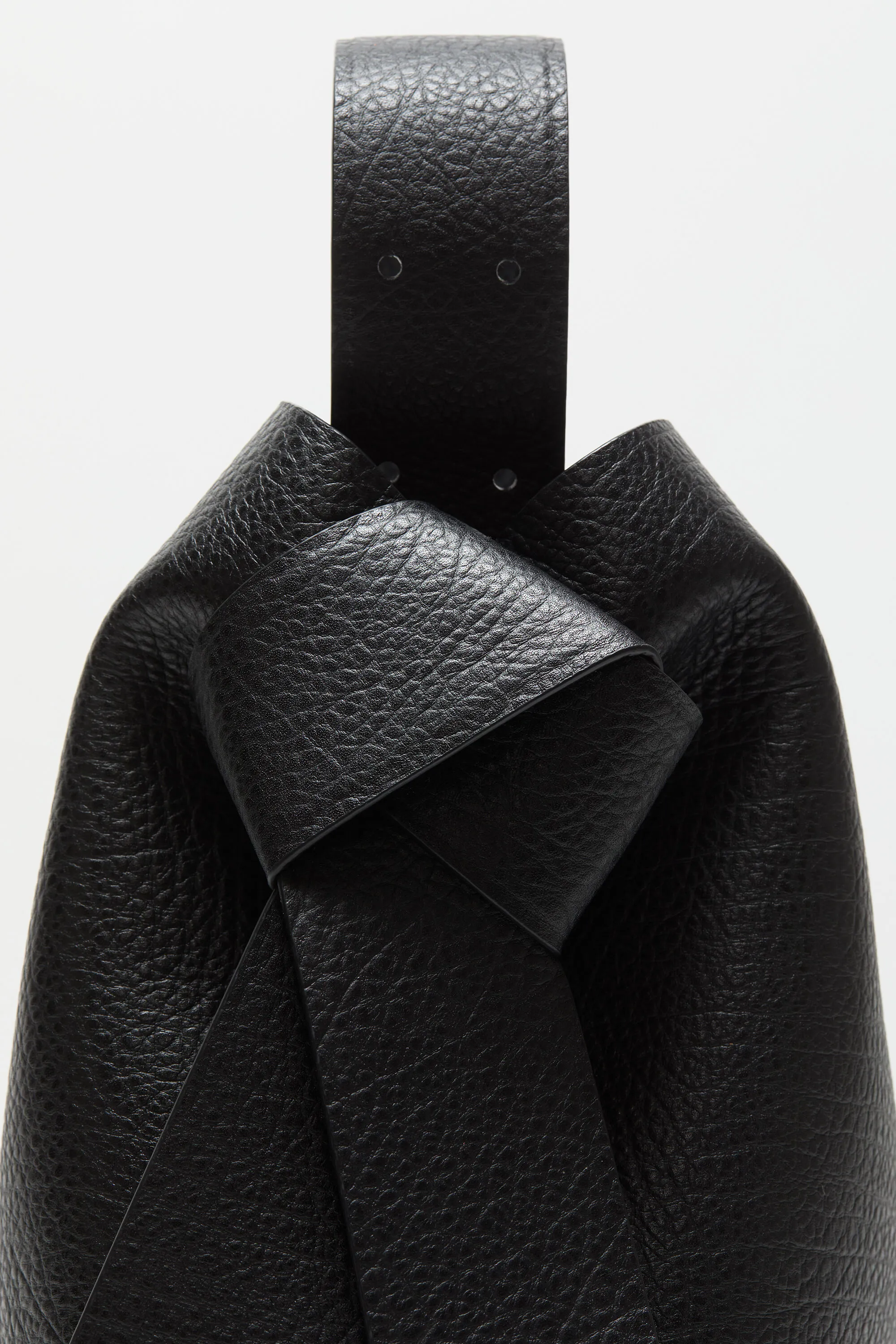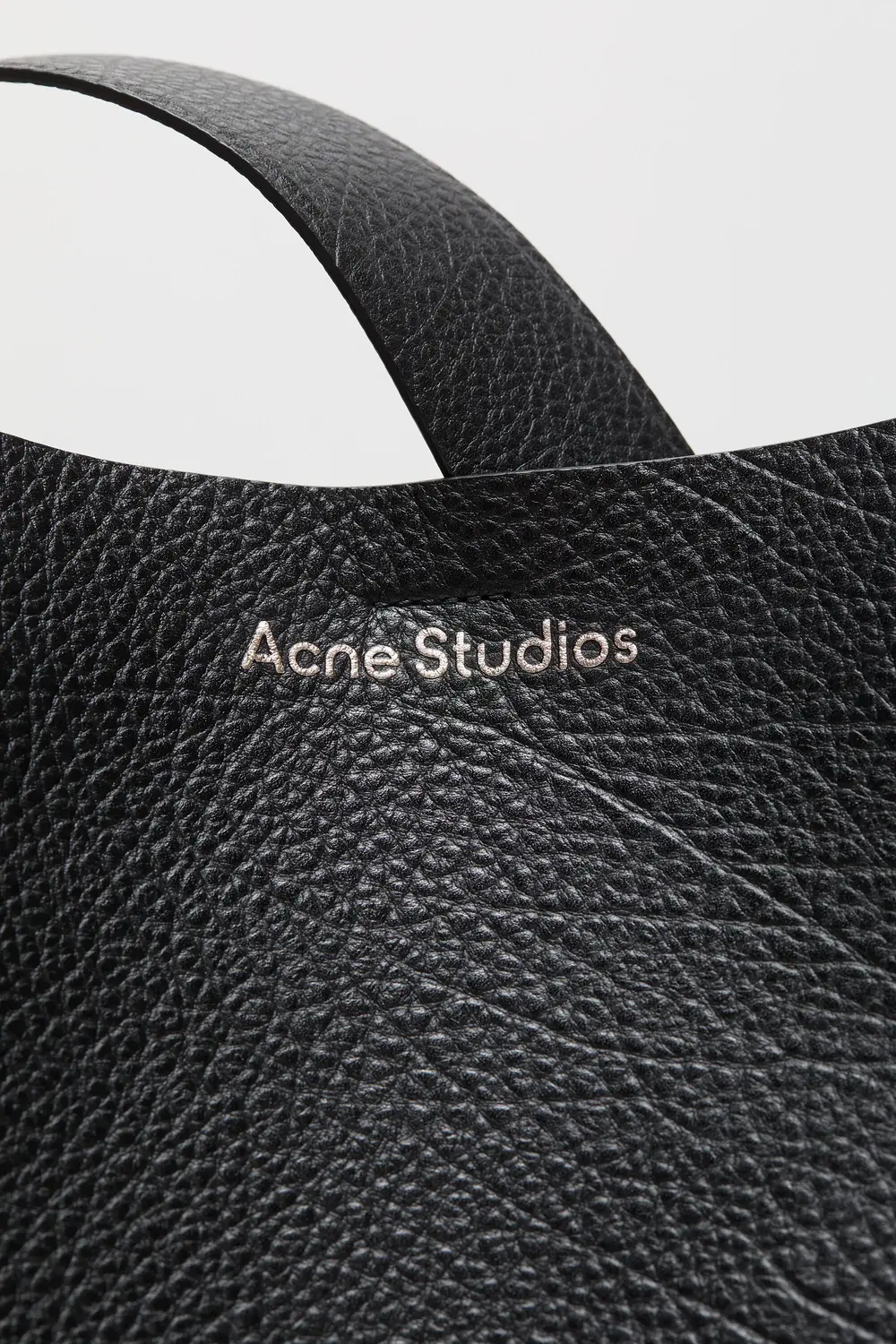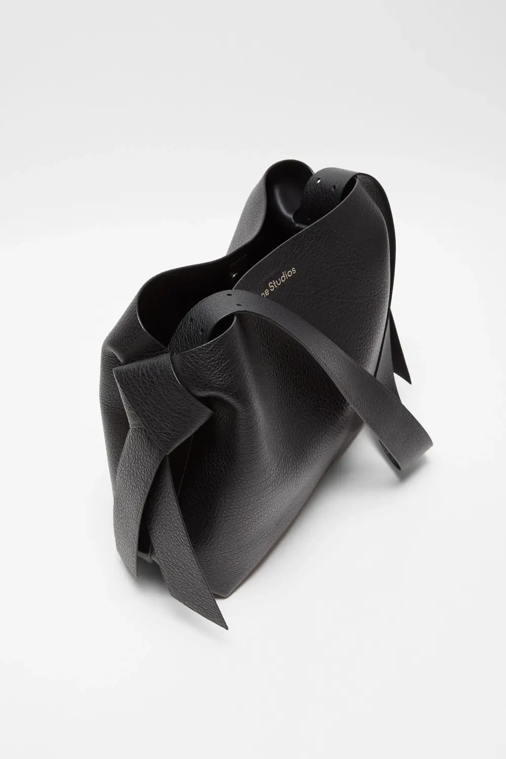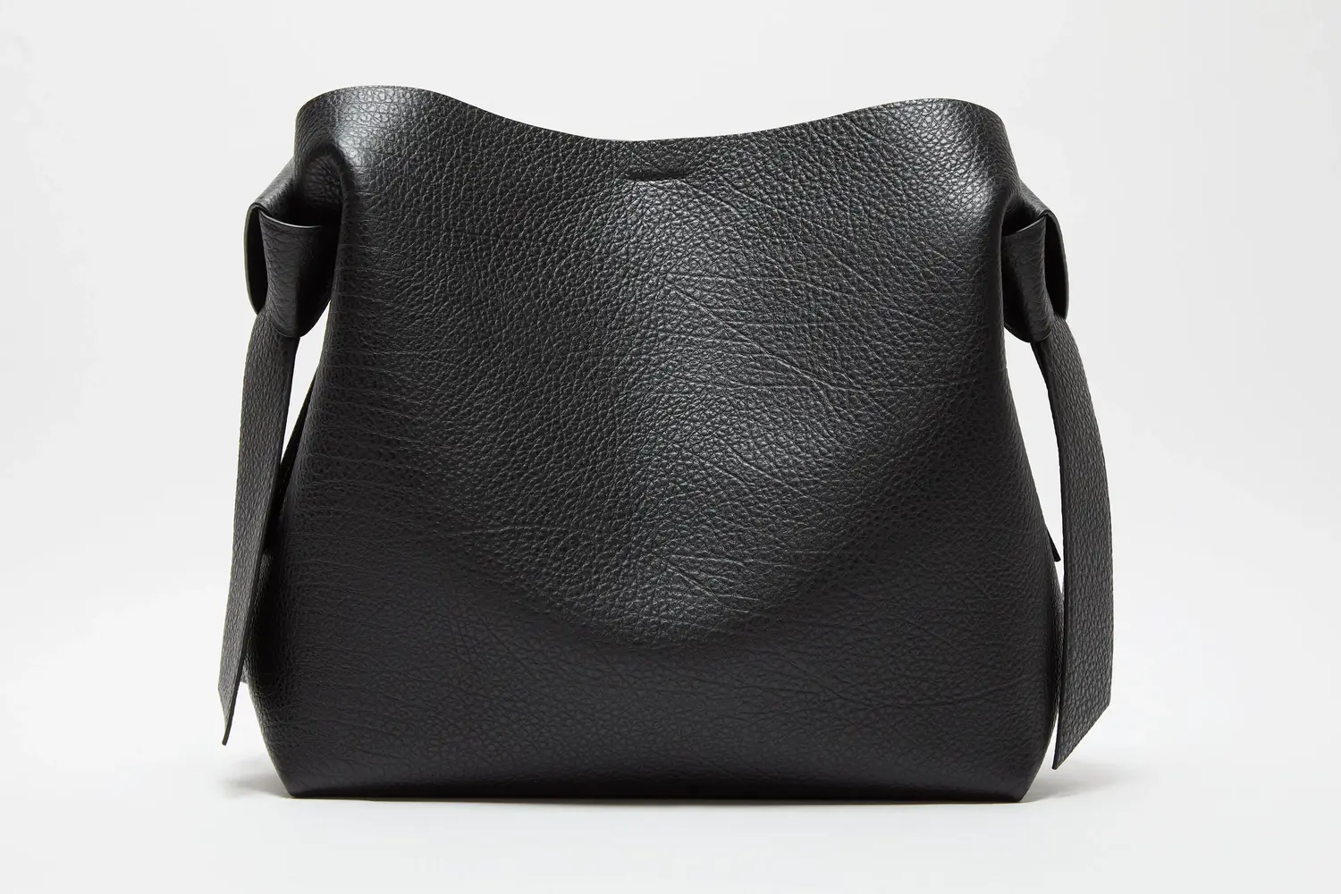 Сумка через плечо миди украшена закрученными узлами мусуби с каждой стороны, вдохновленными традиционными японскими поясами оби. Изделие выполнено из зернистой телячьей кожи, украшено тисненым логотипом Acne Studios. Дополнен средним карманным отделением на молнии и дискретной магнитной застежкой.