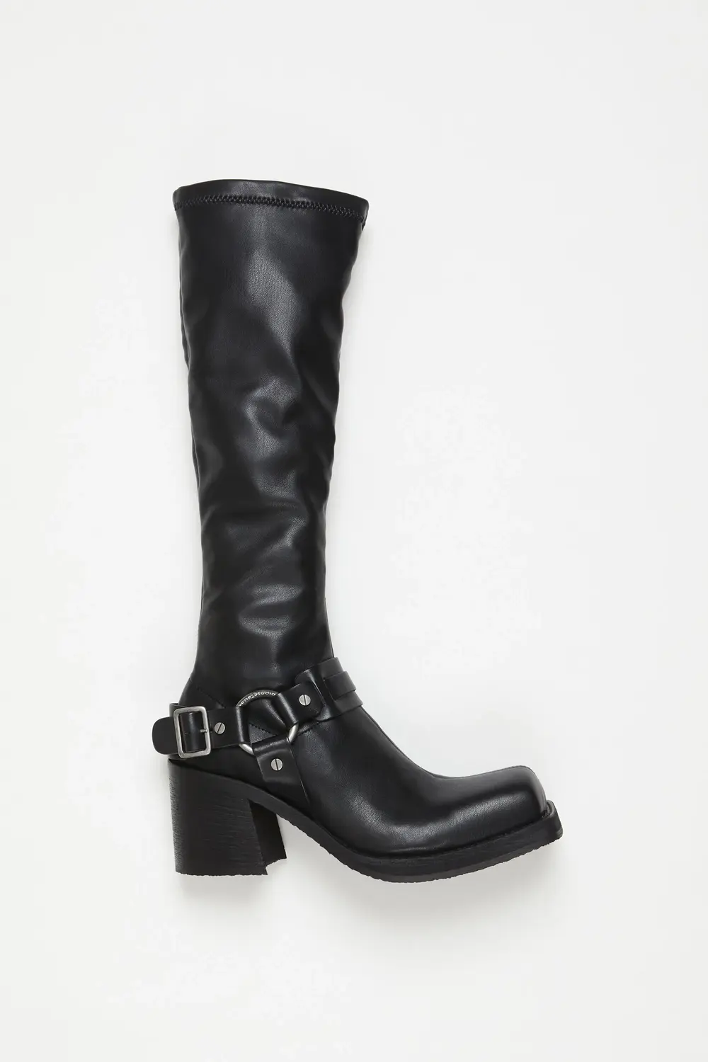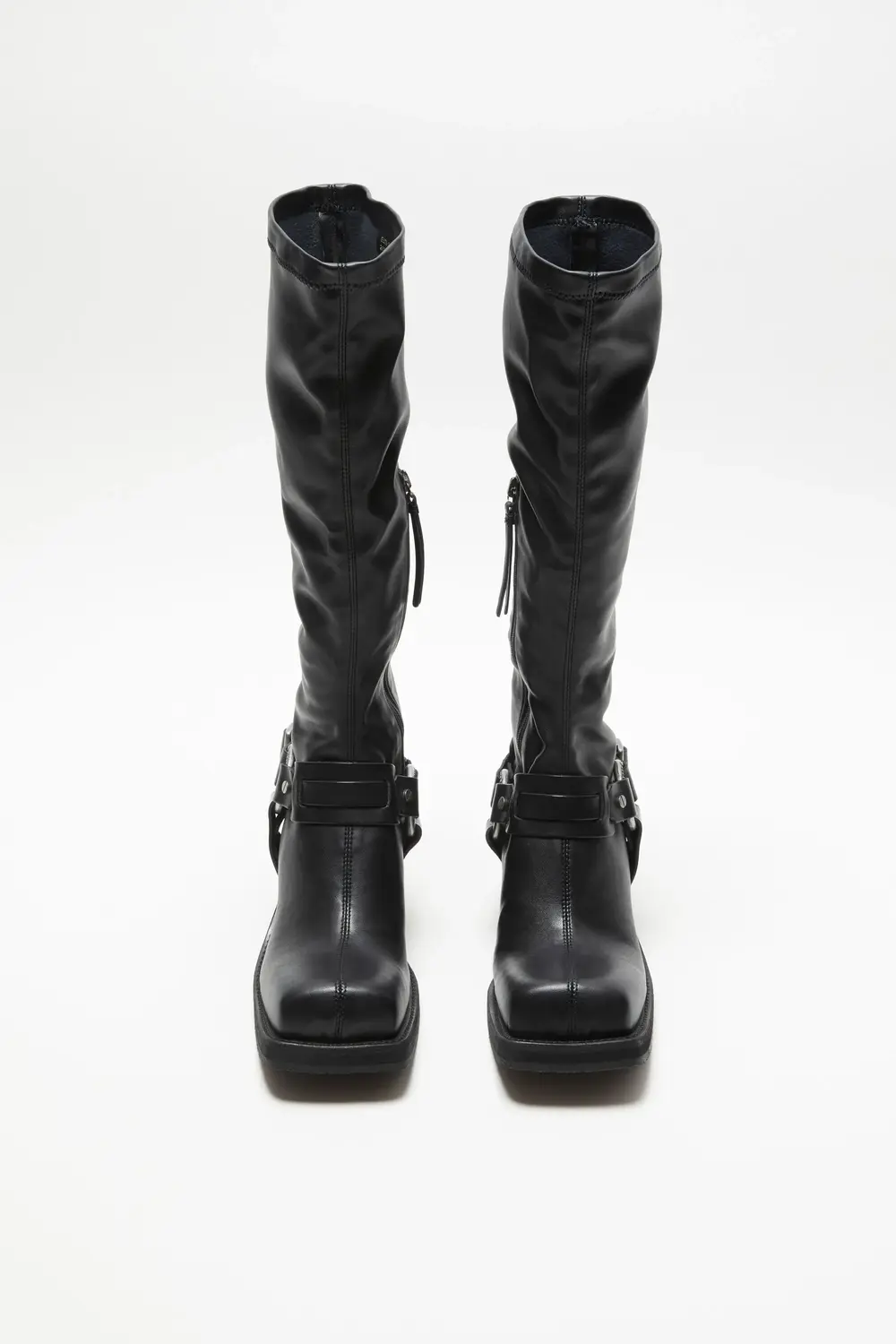 Обтягивающие ботинки оснащены пряжками в байкерском стиле и ремнями стремян с металлическими заклепками серебристого оттенка. В комплекте с квадратным носком и массивным блочным каблуком.