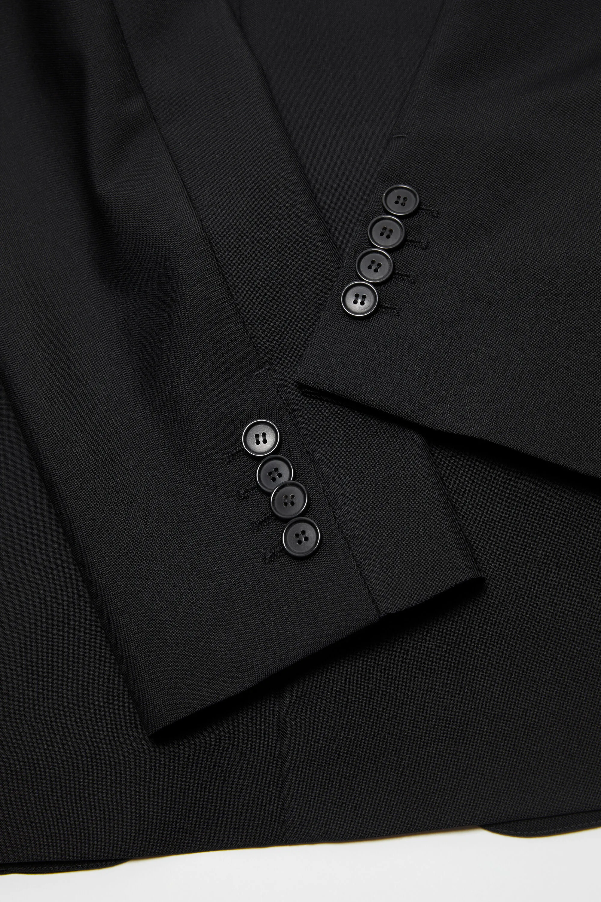 Однобортный пиджак скроен по стандартной посадке, с построенными плечами и длиной ниже бедер. Изготовлен из смесовой шерсти.