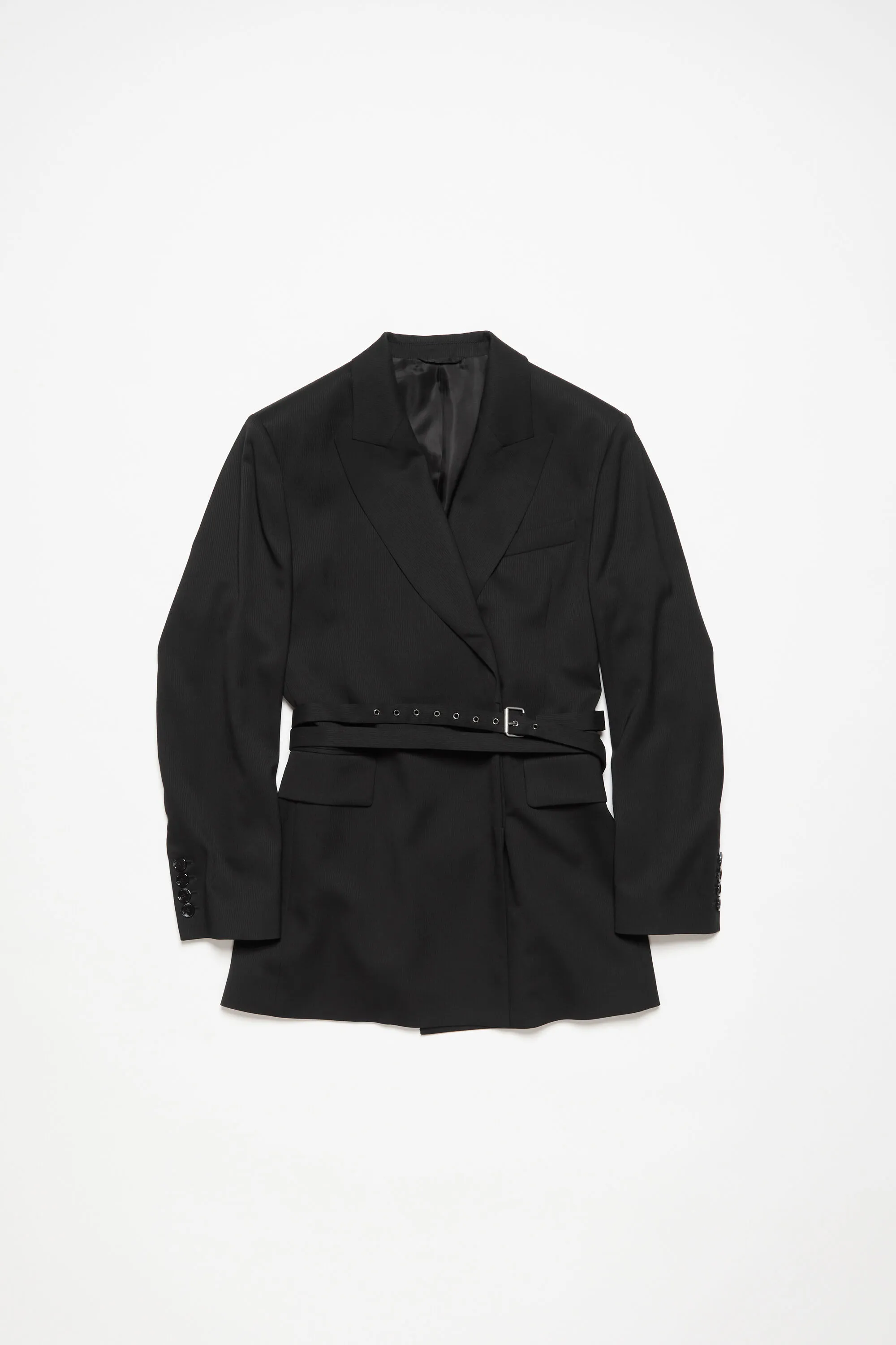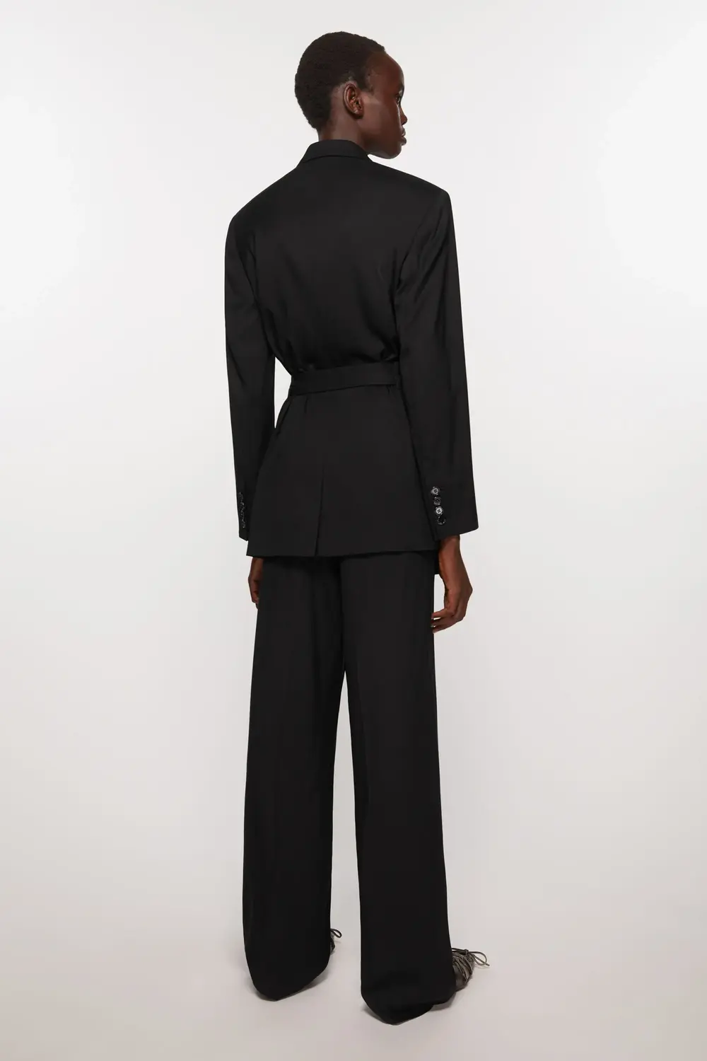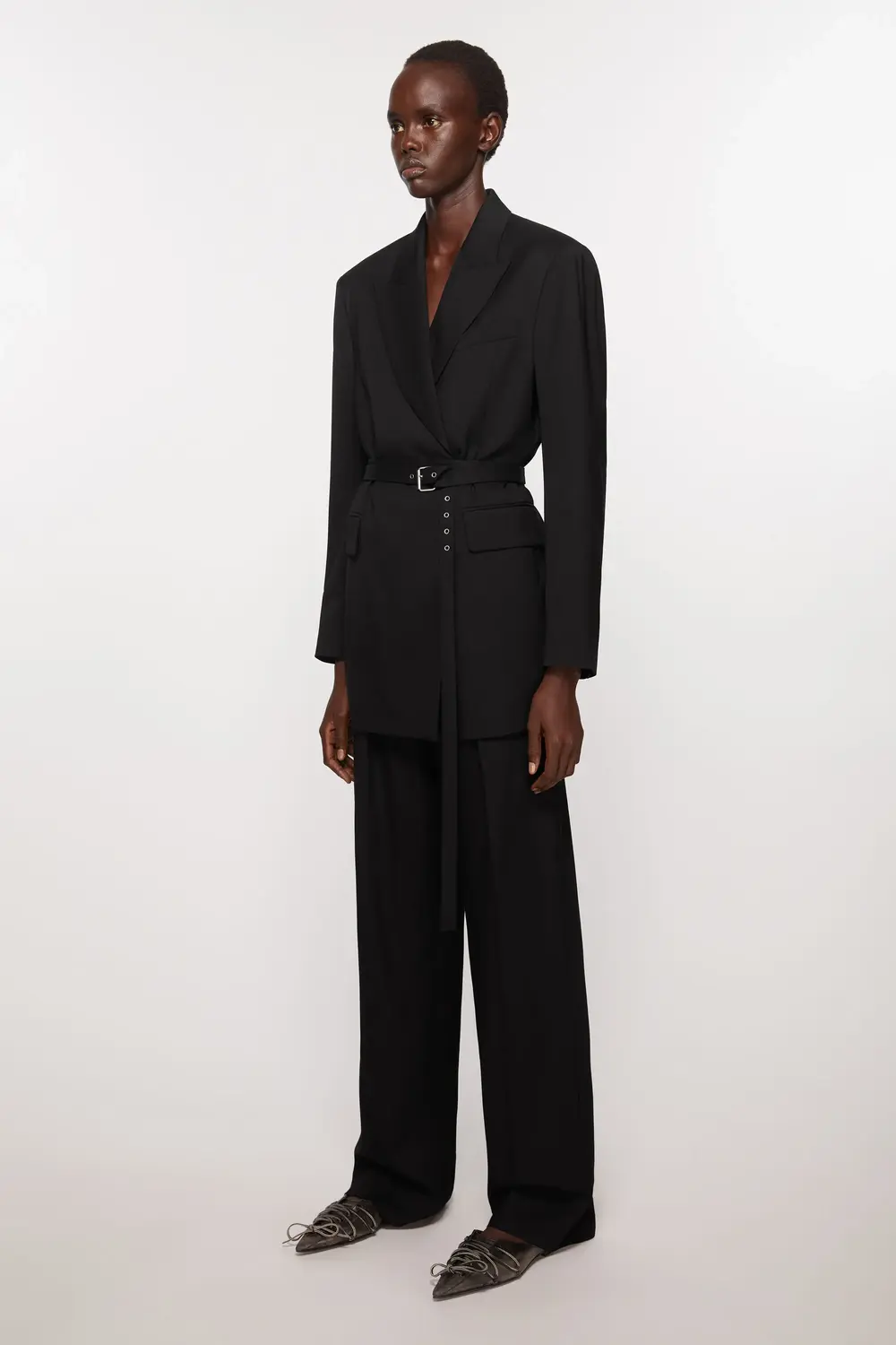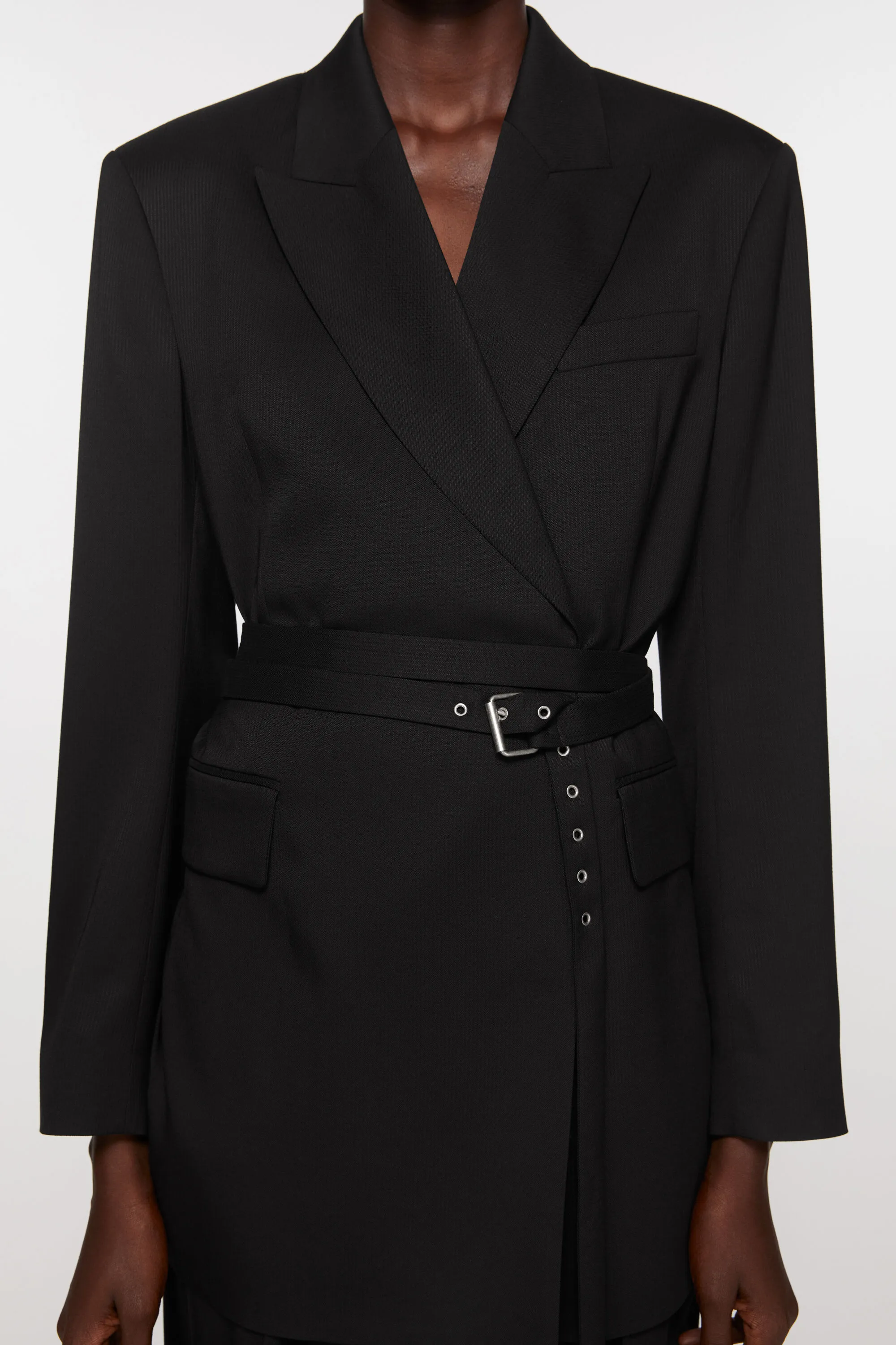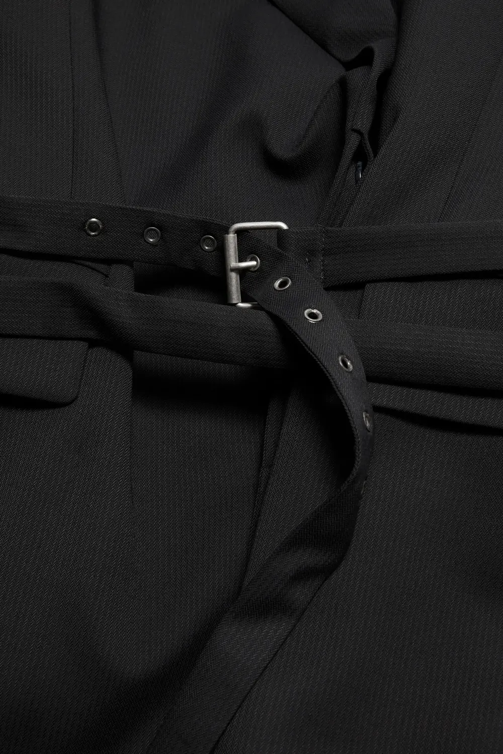 Двубортный пиджак имеет свободный крой, сконструированные плечи и длину ниже бедер. Дополнен поясом на талии и потайной застежкой на пуговицы спереди.