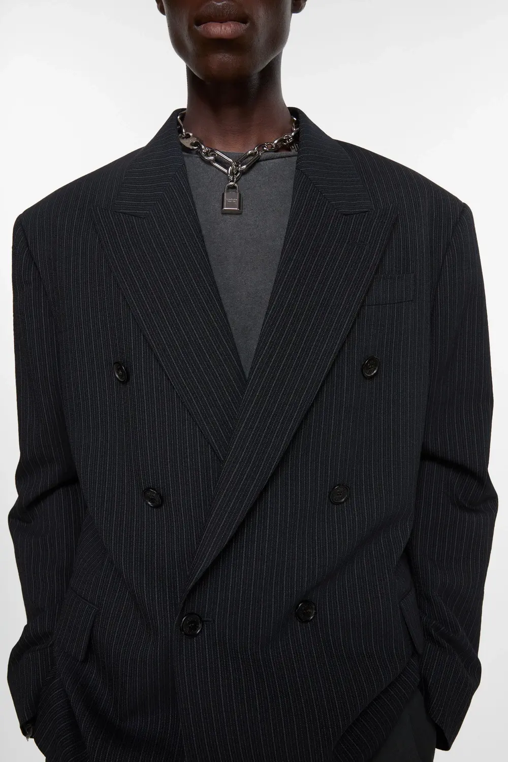 Двубортный пиджак выполнен из смесовой шерсти, пряжи, окрашен в тонкую полоску, сплетен в тонкую елочку. Конструкция с остроконечным лацканом и центральным передним вырезом на 6 пуговицах. Свободный крой с мягкими плечами и длиной бедер.