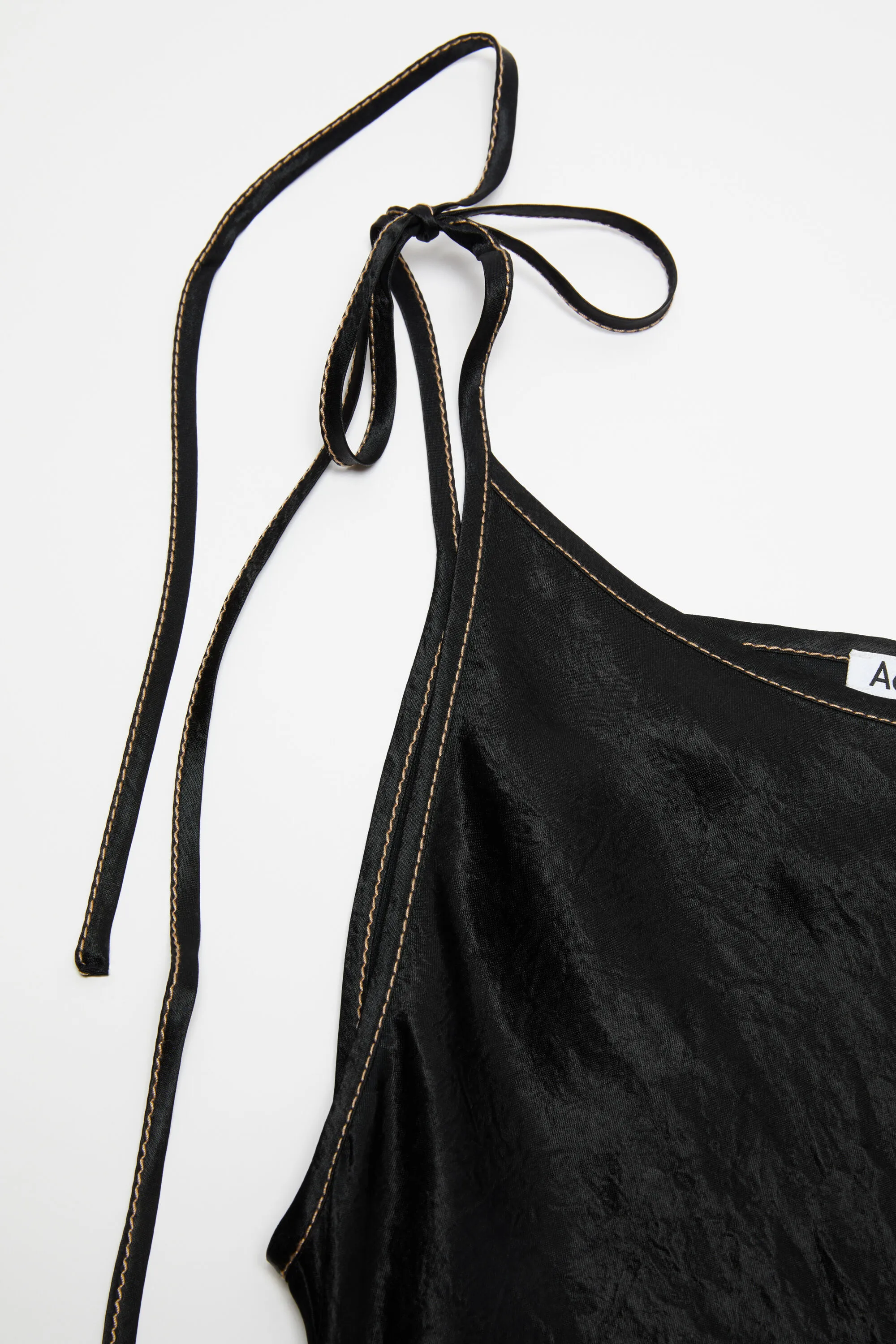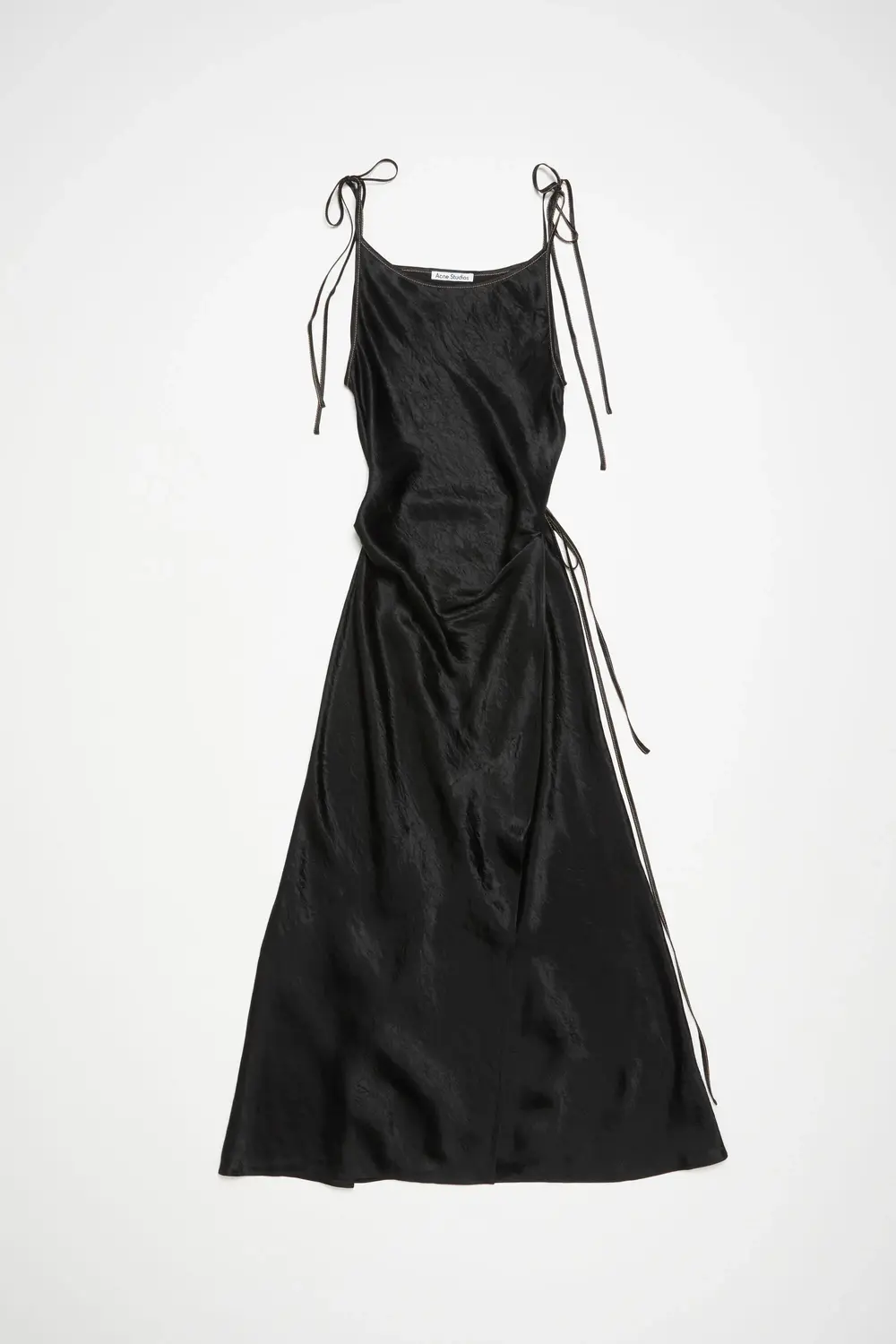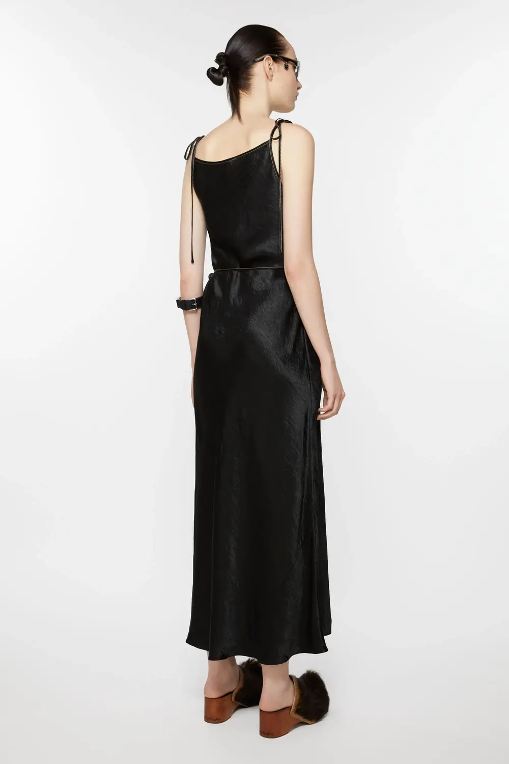 Платье косого кроя кроится по стандартной посадке и средней длины. Выполнен из струящейся атласной ткани с контрастными деталями верхнего стежка. В комплекте с завязкой и регулируемыми плечевыми ремнями.