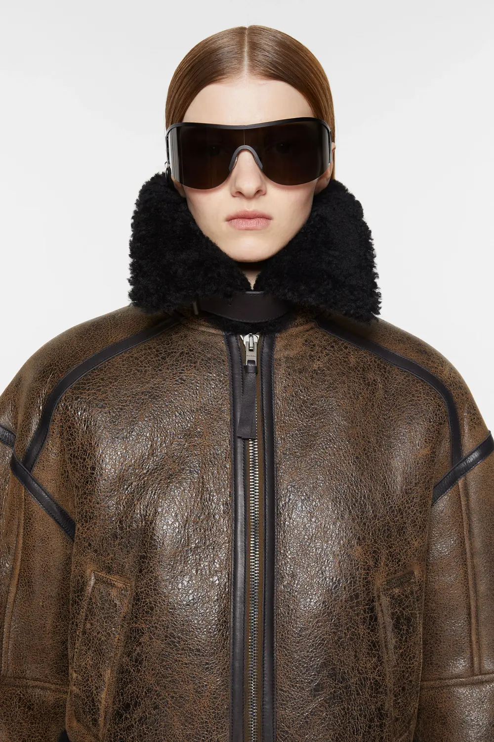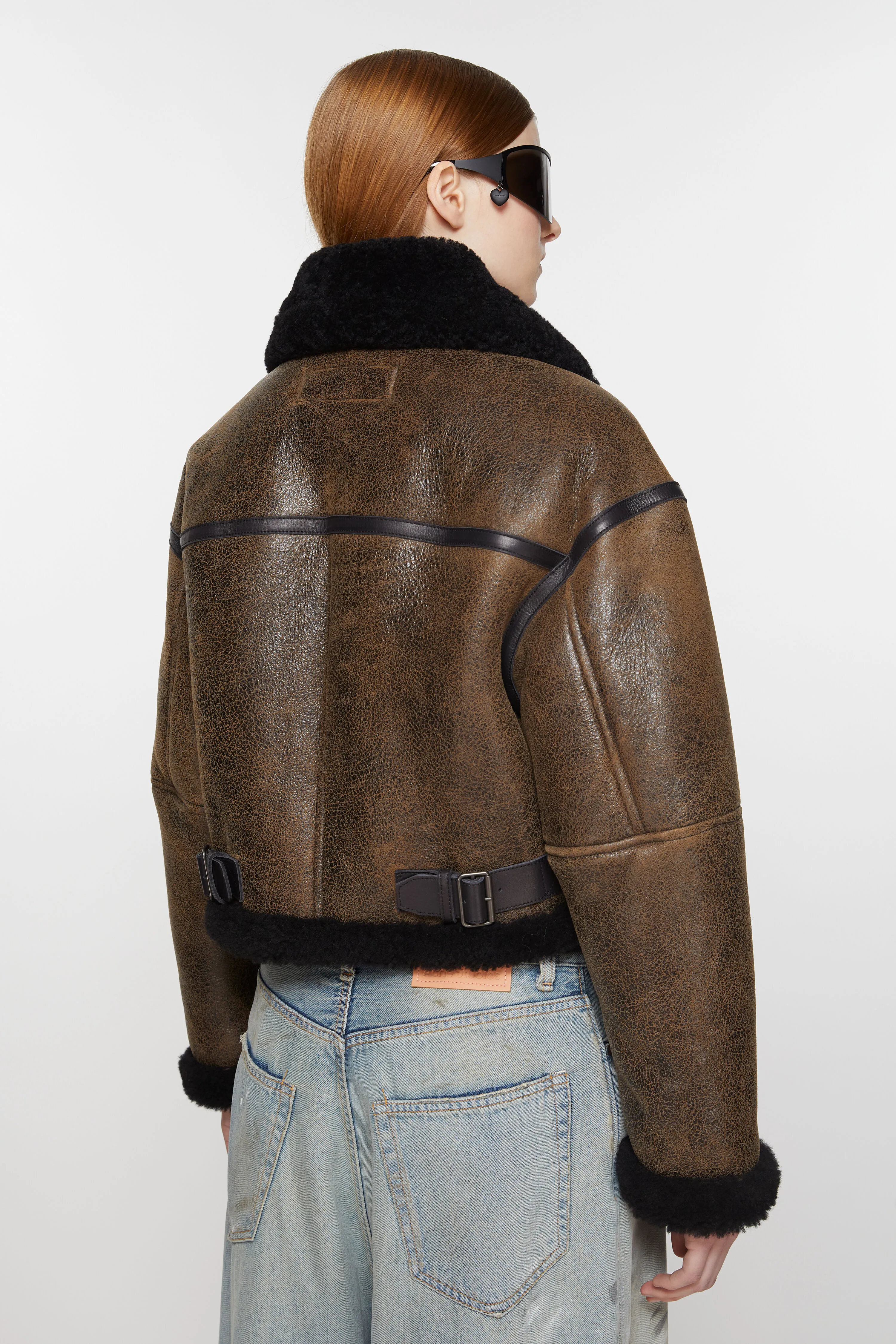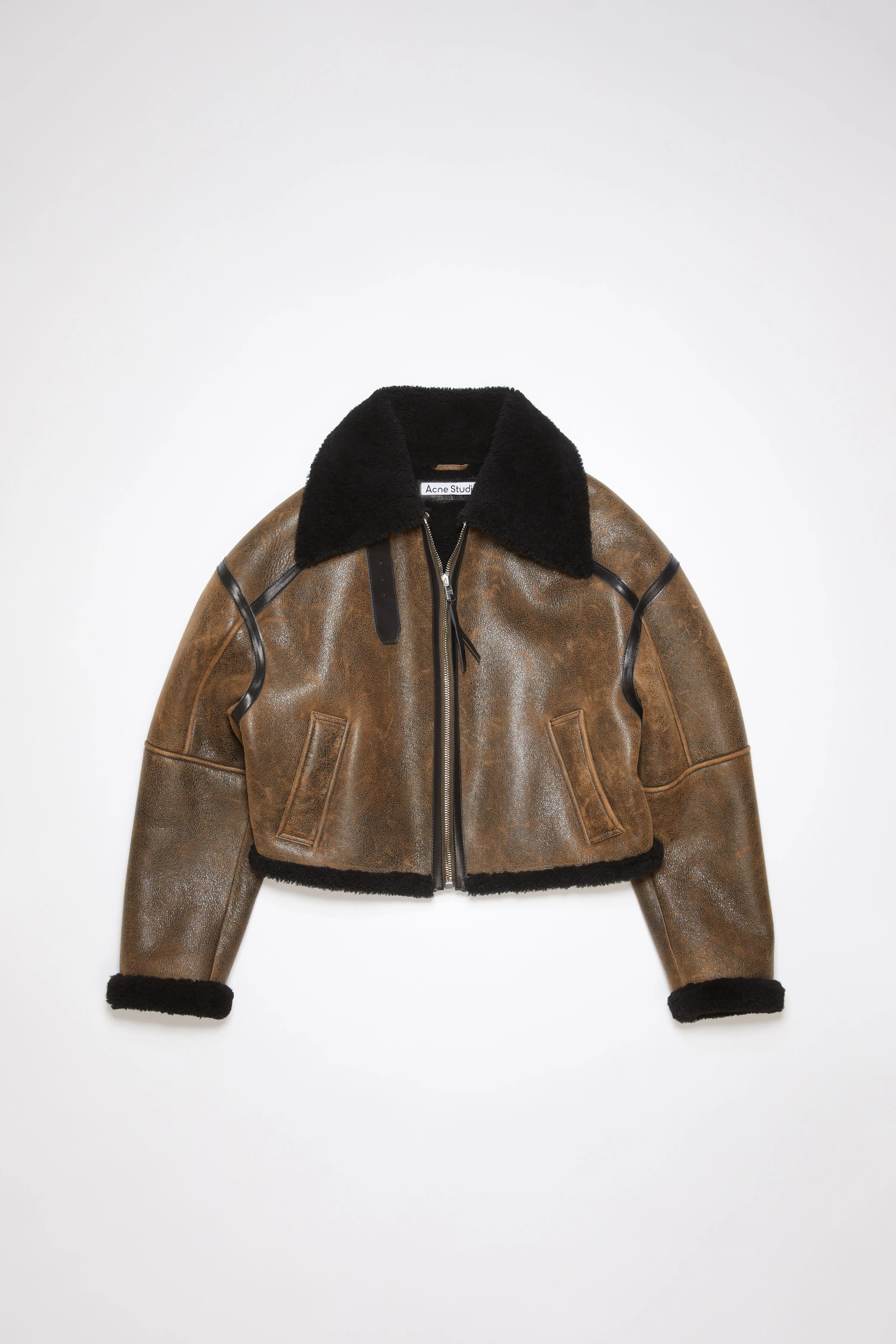 Темно-коричнево-черная куртка Acne Studios выполнена из овчины мериноса и кожи с потрескавшейся отделкой. В комплекте с застежкой на молнию спереди и прорезными карманами. Обрезать до свободного кроя и длины талии.