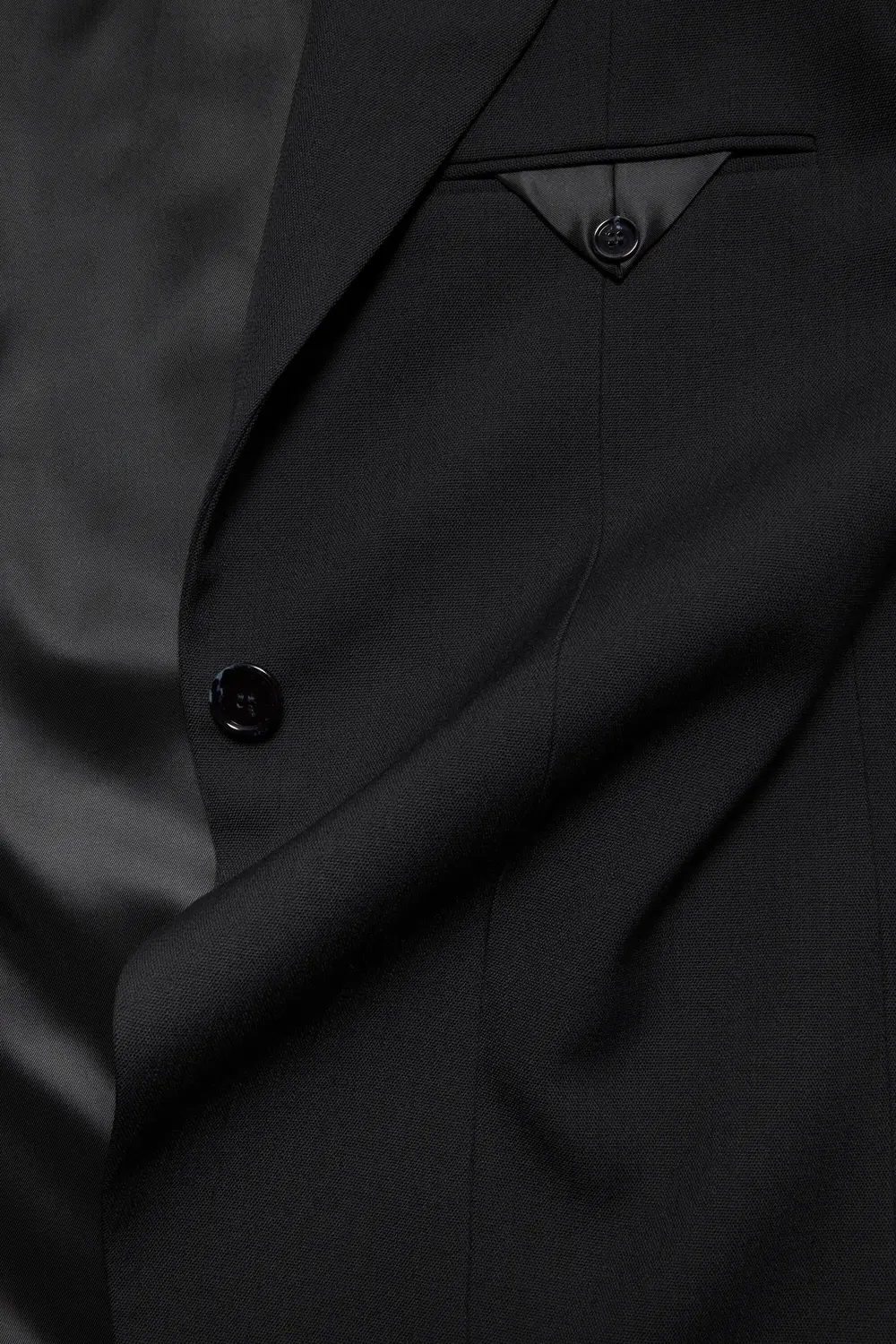 Сшитый на заказ однобортный пиджак имеет свободный крой, спущенные неподготовленные плечи и длину до середины бедра. Изготовлен из смесовой шерсти с вывернутой наизнанку конструкцией.