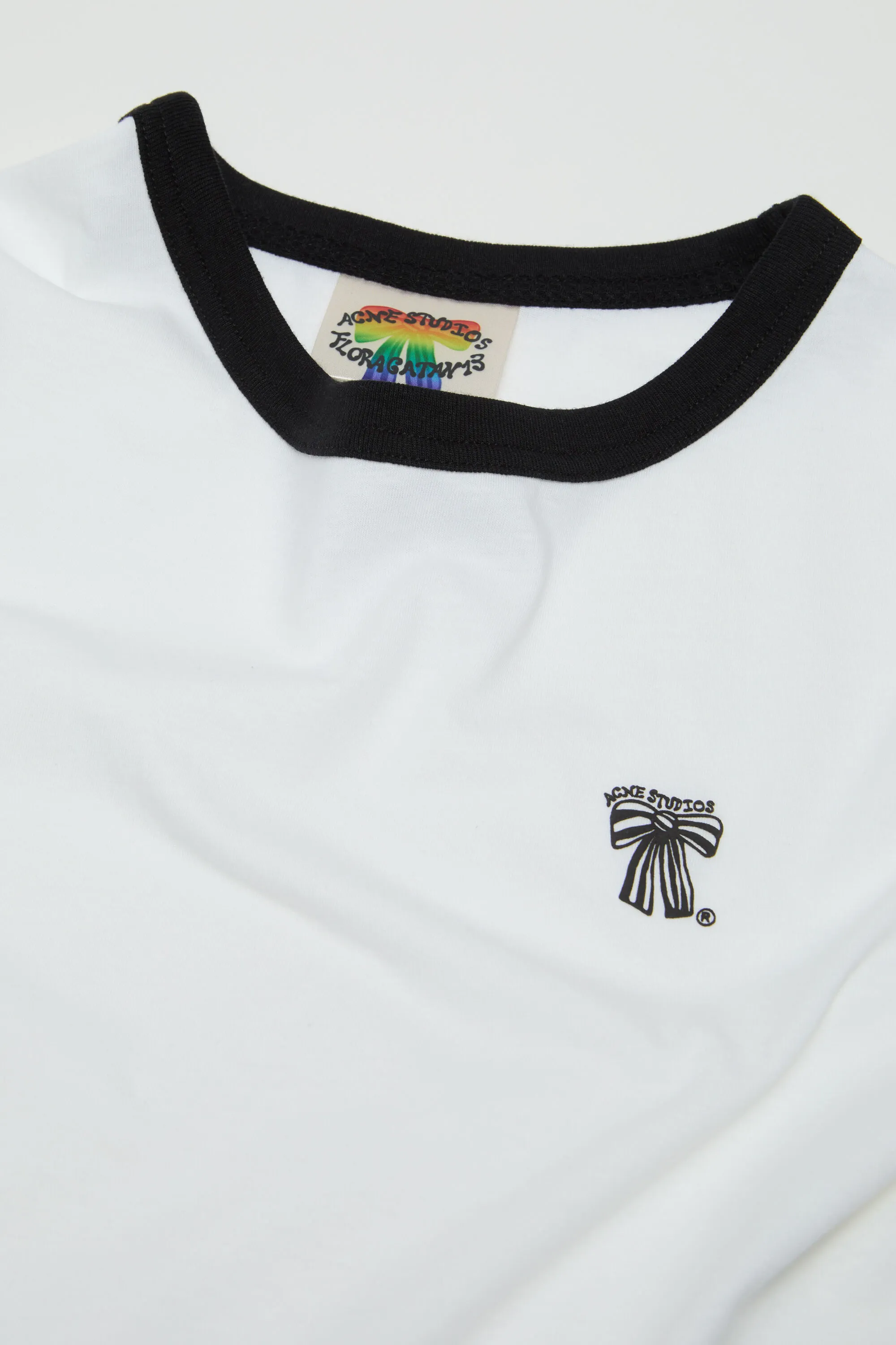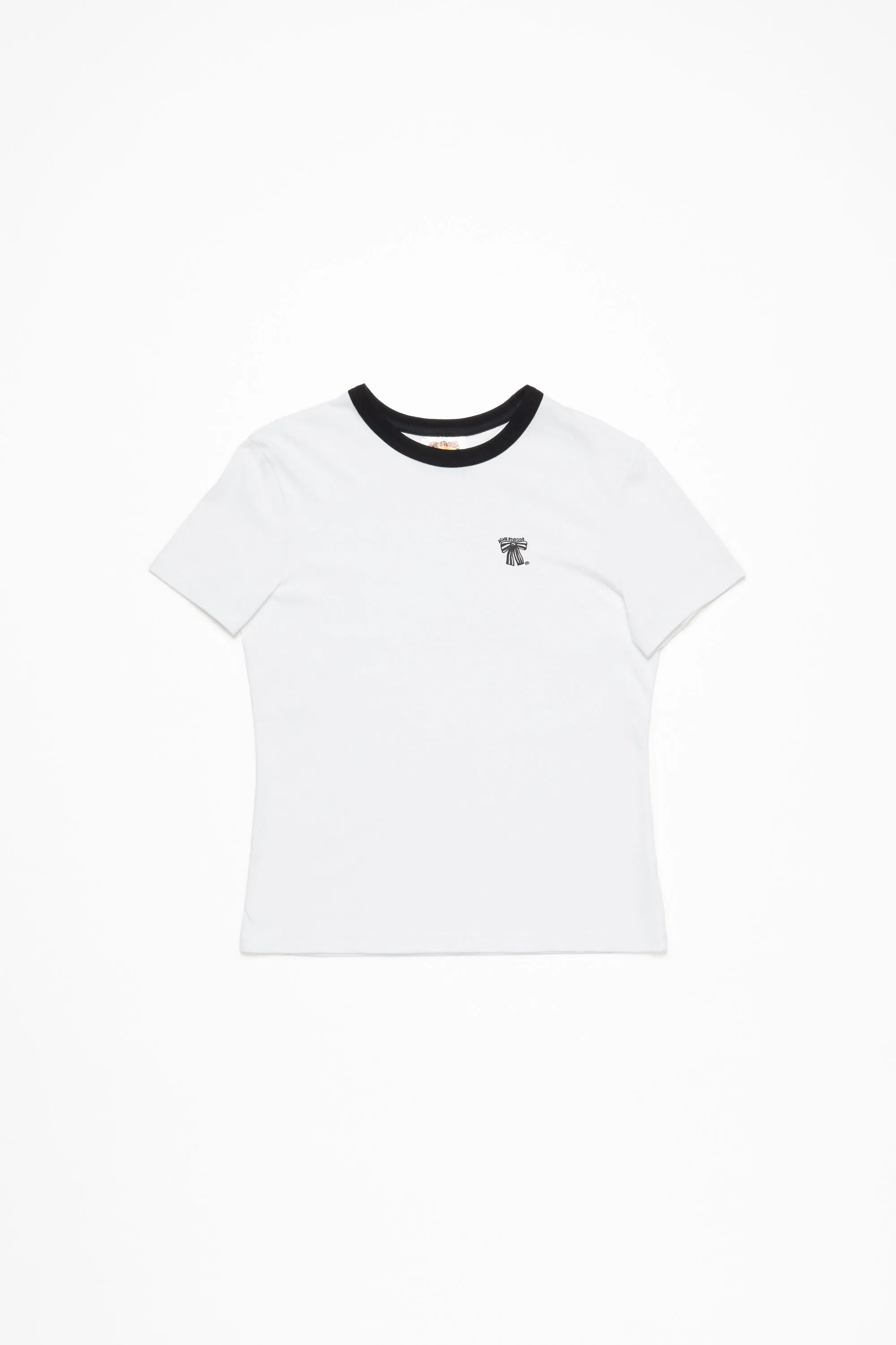 Футболка с круглым вырезом изготовлена из легкого трикотажа из смесового хлопка. Детализирован с небольшим логотипом в виде банта на груди. Обрезайте до обычной посадки унисекс и длины бедер.