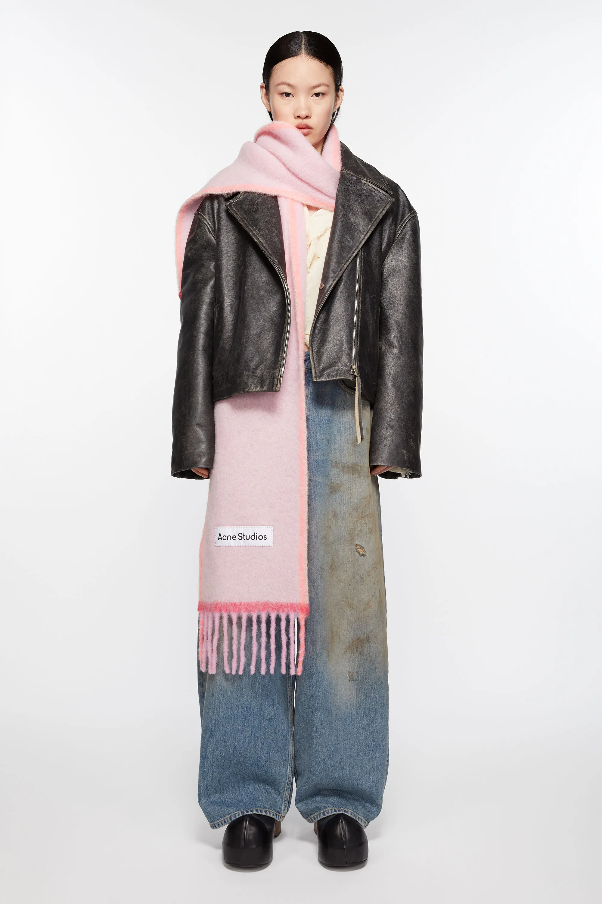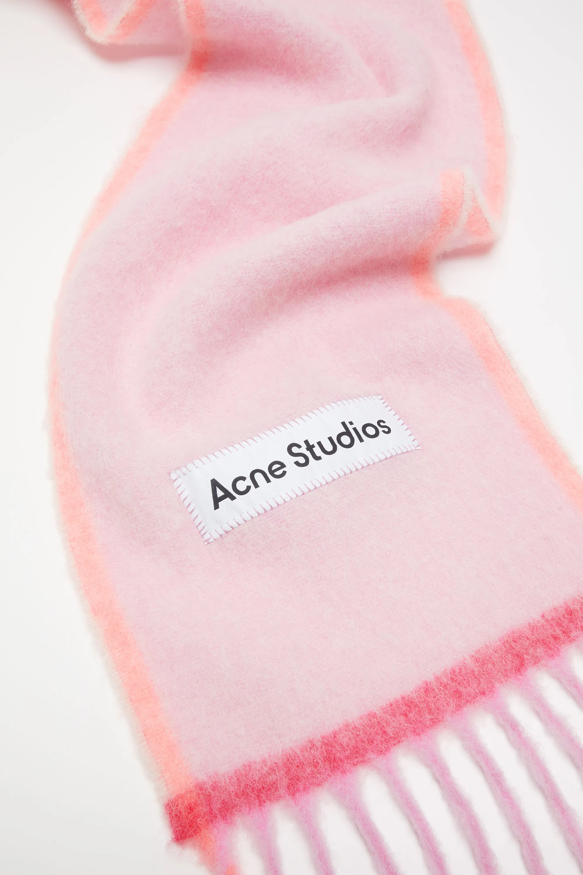 Шарф с бахромой изготовлен из богатой смеси шерсти и мохера, украшен вышитой этикеткой с логотипом Acne Studios и контрастным обрамлением.