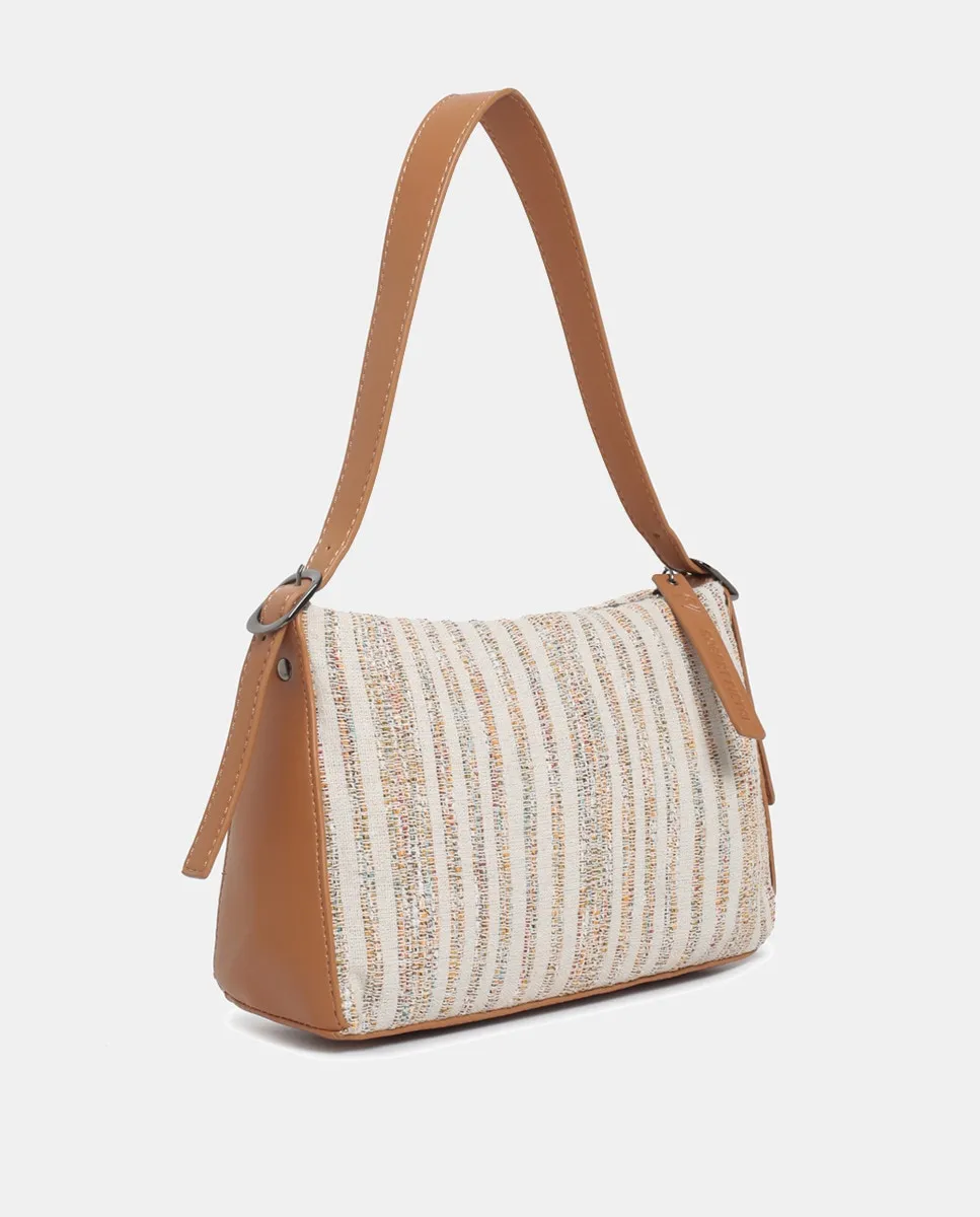 Сумка через плечо из искусственной кожи натурального цвета, съемный плечевой ремень, а также регулируемый и съемный плечевой и через плечо ремень, застежка-молния, 2 внутренних кармана.