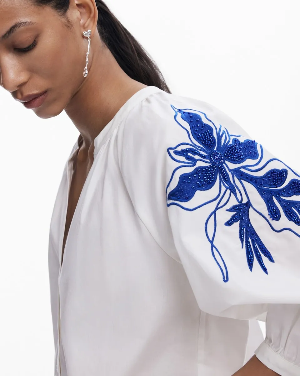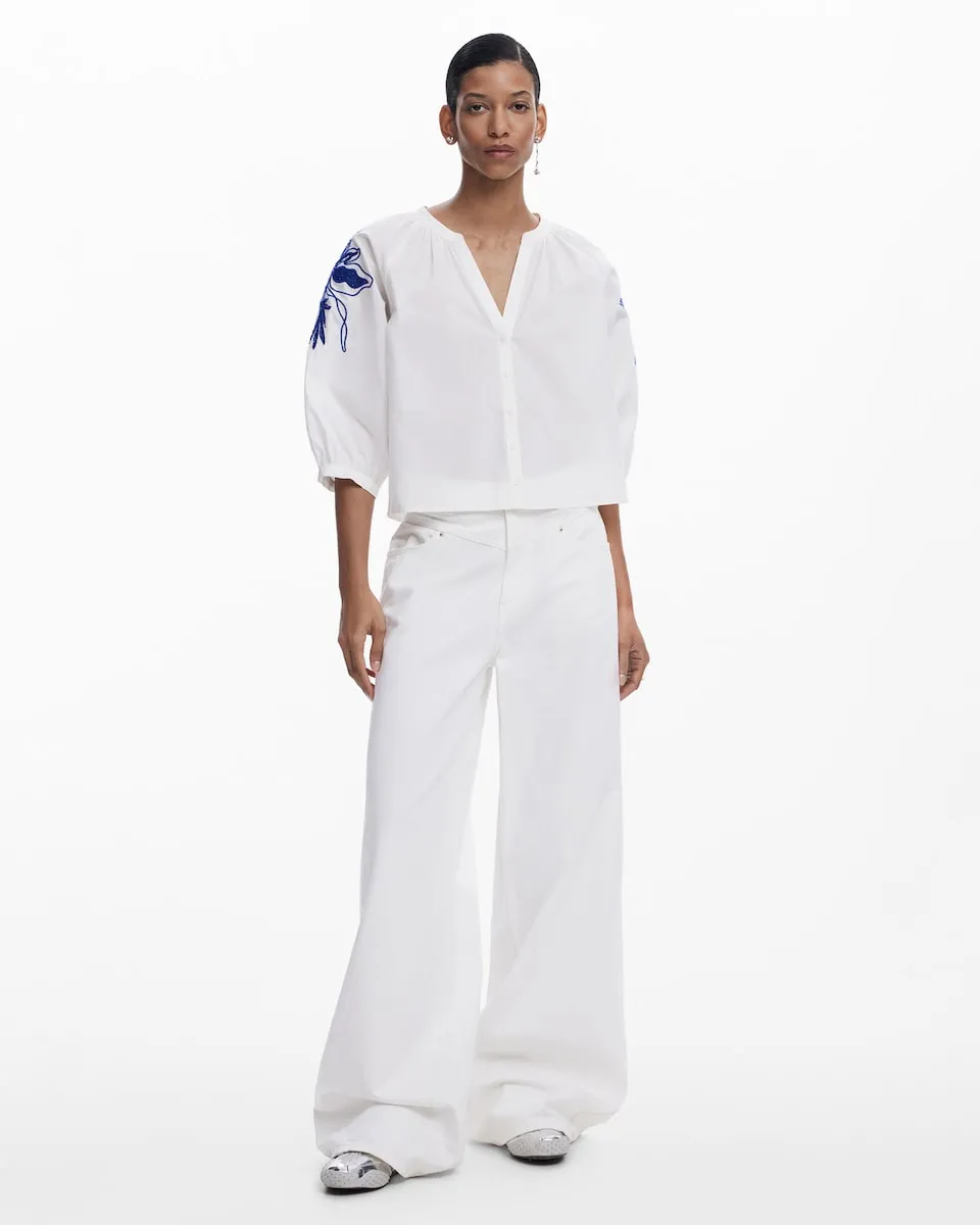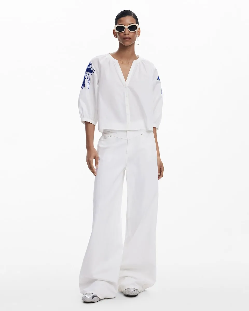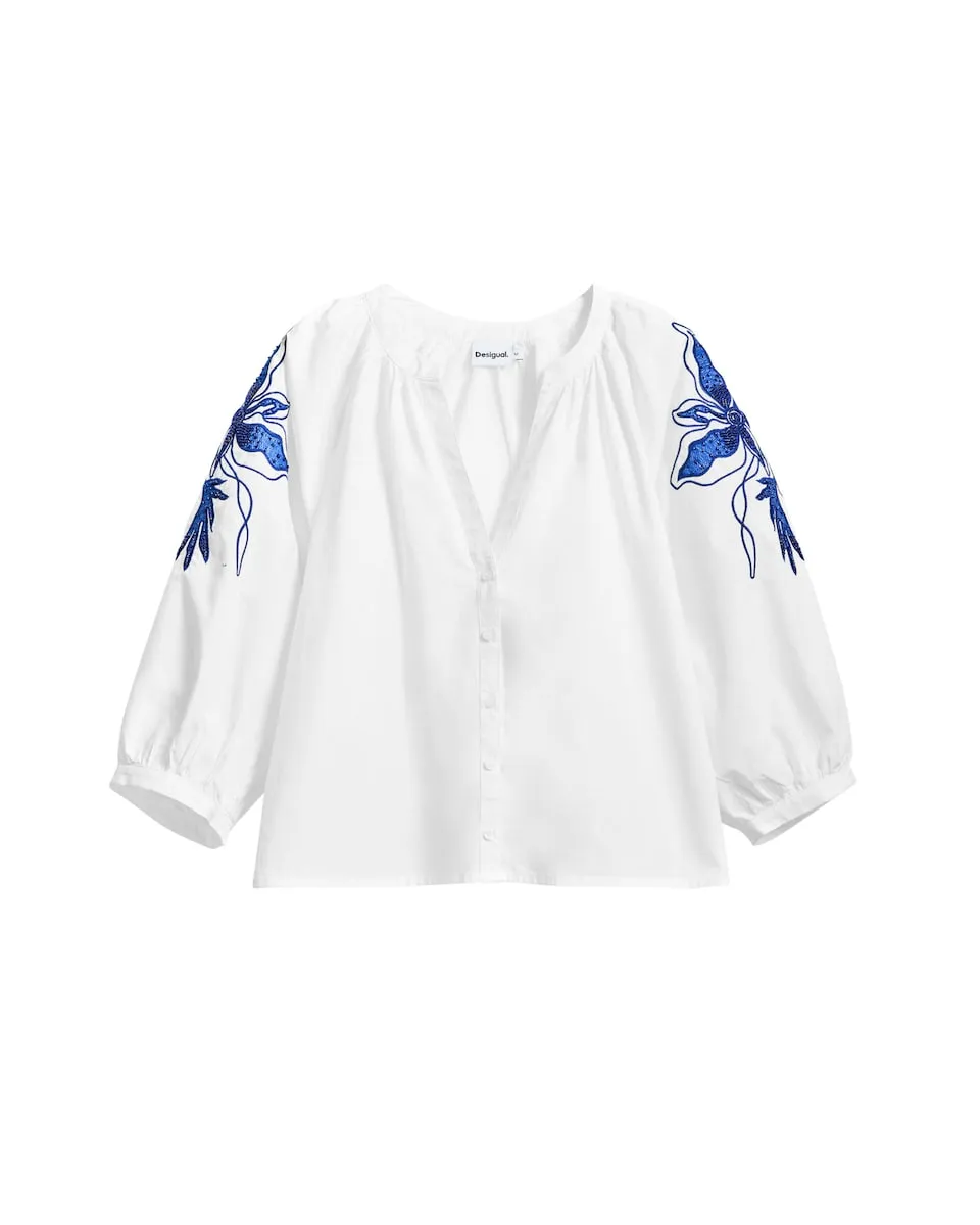 Блузка с французскими рукавами-фонариками, застежкой на пуговицы и однотонными цветочными деталями на рукавах. Огранка: Обычная. V-образный вырез. Рукав до половины. Застежка на пуговицы. Приобретая хлопковые изделия у Desigual, вы поддерживаете наши инвестиции в Better Cotton. Этот продукт получен с помощью системы баланса массы и может не содержать Better Cotton. bettercotton.org/massbalance..