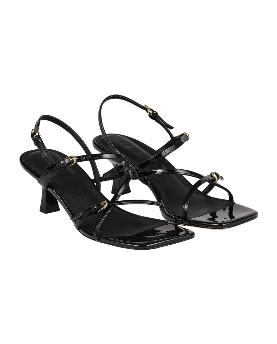 Босоножки из тонкой лакированной кожи с регулируемыми ремешками и низким каблуком. Женские лакированные босоножки с ремешками Sandro. Различные пряжки. Высота каблука: 6,5 см.