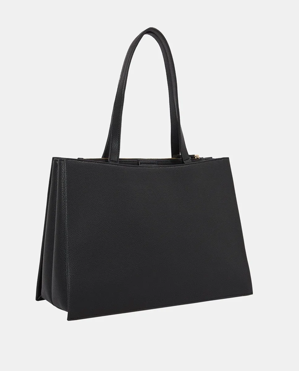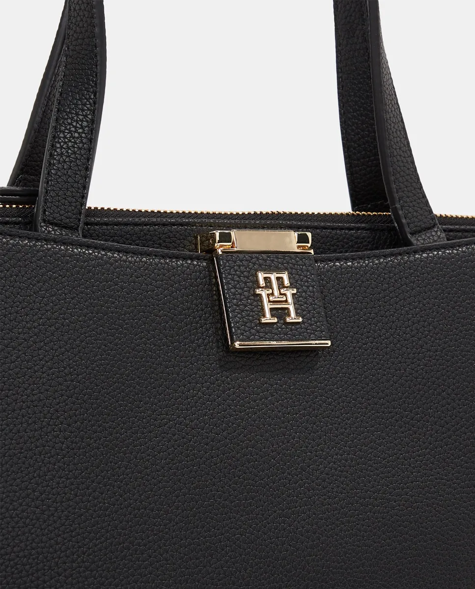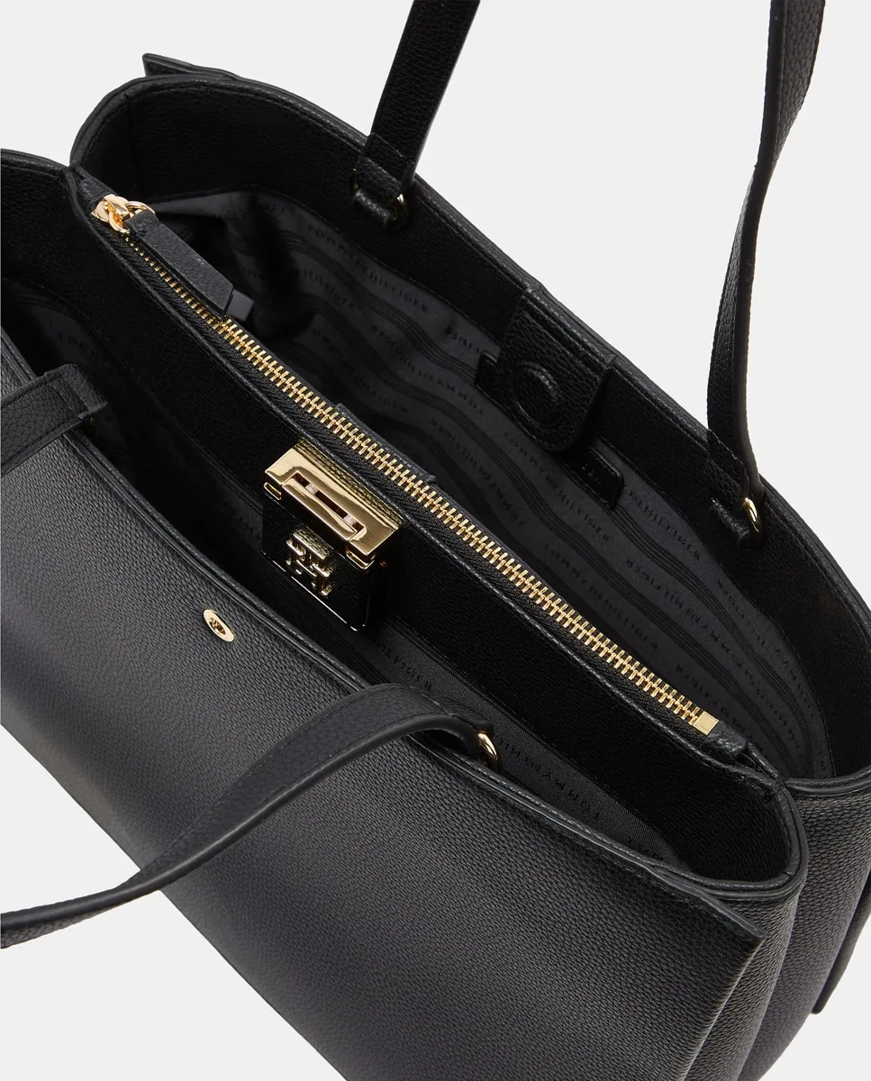 Женская сумка-тоут из черной экокожи. Модель с застежкой-молнией и металлическим логотипом Tommy Hilfiger.