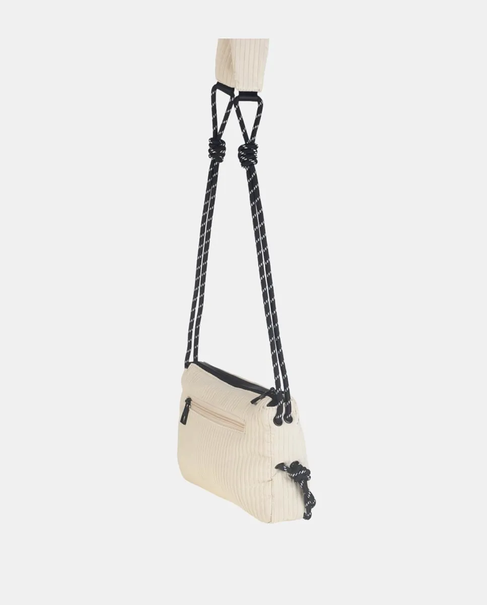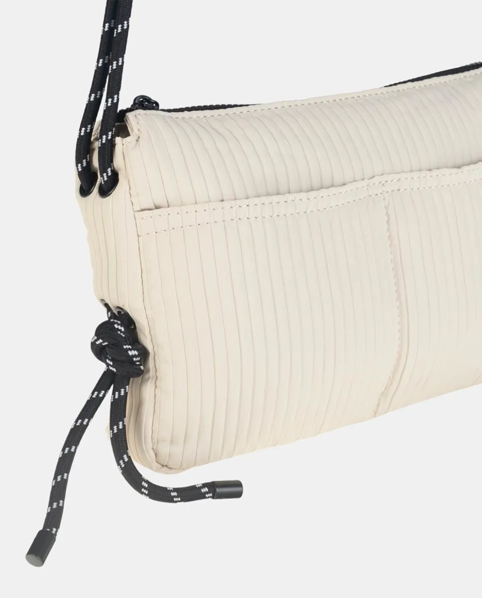 Сумка через плечо из нейлона Kbas бежевого цвета, подчеркивающая текстуру с вертикальными линиями. Черная застежка-молния сверху сочетается с регулируемыми лямками на плечевом ремне, дополняя спортивный стиль этой коллекции. Два больших кармана спереди и еще один карман на молнии сзади. С одной стороны круглый логотип бренда в черно-белом исполнении.