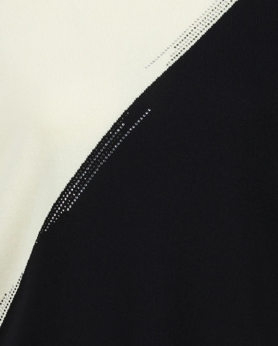 Однотонный трикотаж, двухцветный перед с аппликациями из кристаллов, круглый вырез горловины, рукава 3/4.