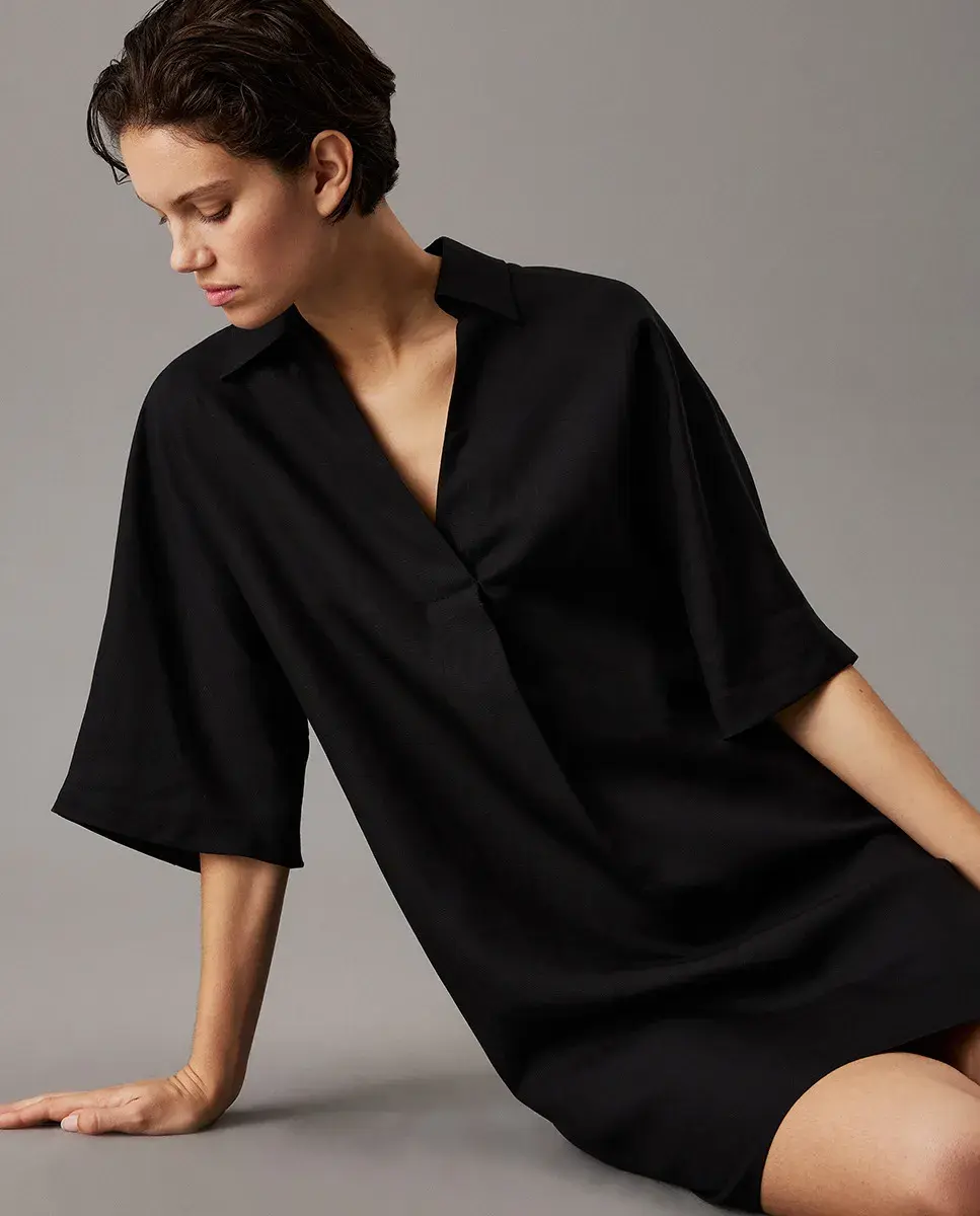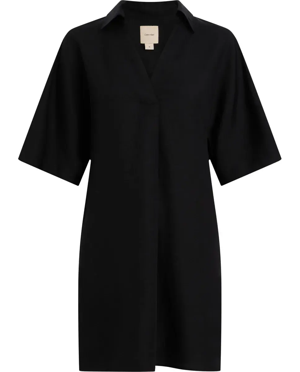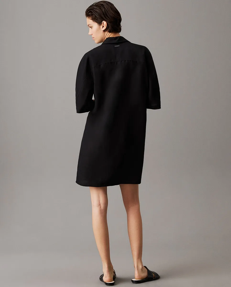 Элегантность. Современность. Женская одежда Calvin Klein привнесет изысканность в ваш повседневный гардероб благодаря качественным тканям и элегантным деталям. Это женское платье-рубашка из лиоцелла и льна имеет короткие рукава и V-образный вырез.