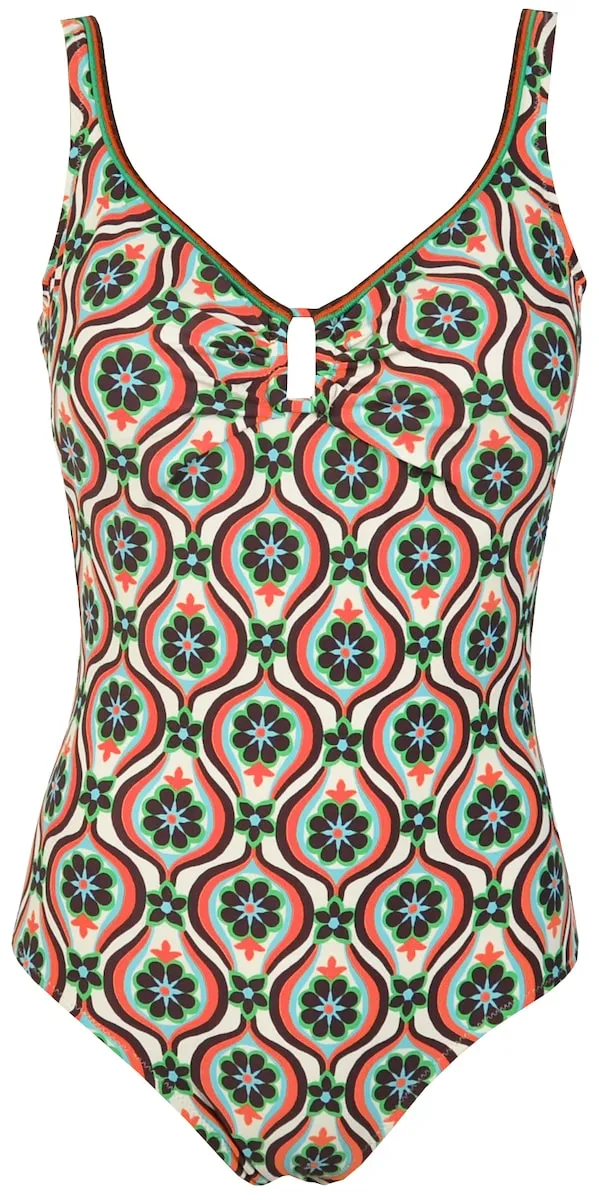 Осмелитесь выделиться с нашим базовым купальником из пеноматериала с чашкой B! Этот купальник с регулируемыми бретелями для идеальной посадки обеспечивает комфорт и поддержку, подчеркивая ваш стиль. Геометрический принт в зеленых, коралловых и коричневых тонах придает изделию молодежный и свежий вид, идеально подходящий для эффектного образа на пляже или в бассейне. Этот купальник, входящий в нашу эксклюзивную коллекцию купальников, можно комбинировать с соответствующими аксессуарами, чтобы создать современный и яркий ансамбль. Сделайте это по-своему и наслаждайтесь летом, полным энергии и стиля!