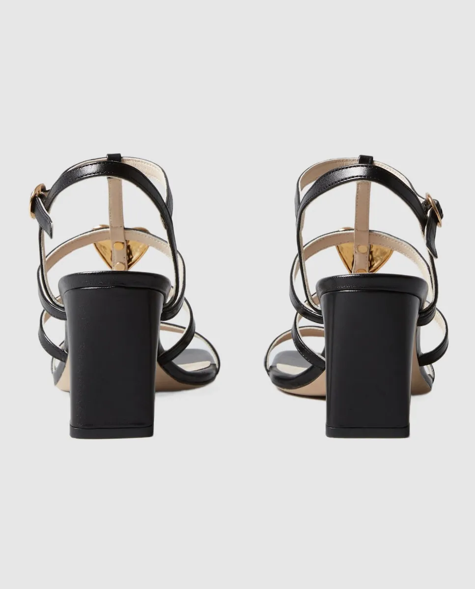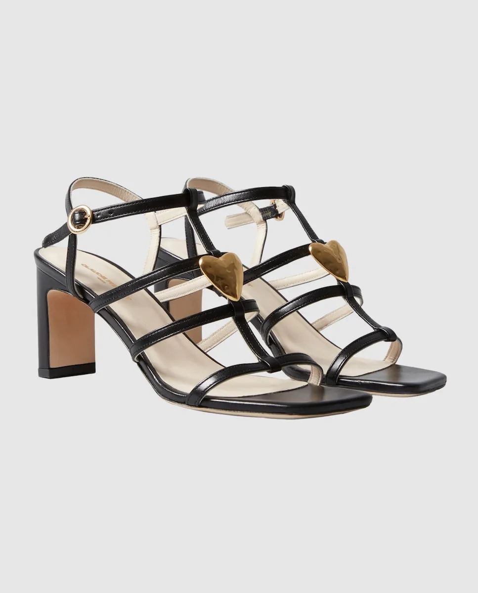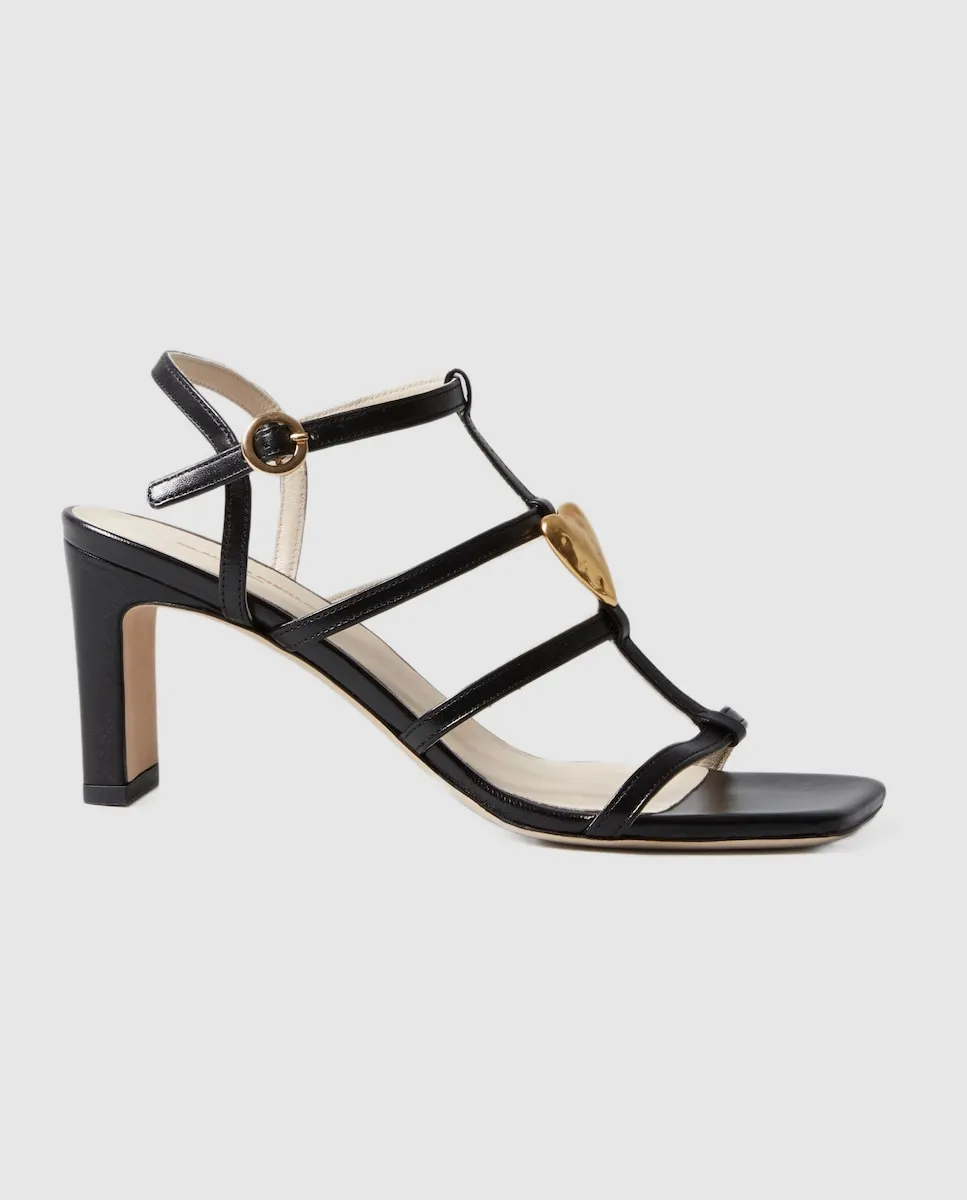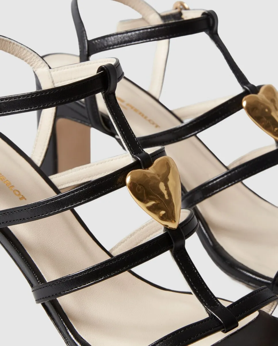 Кожаные босоножки на каблуке с центральным ремешком, украшенным кованым золотым украшением в виде сердца. Кожаные босоножки на каблуке. Центральная полоса с кованым сердечком из золота. Четыре тонкие полоски спереди. Тонкий регулируемый ремешок. Каблук 7,5 см.