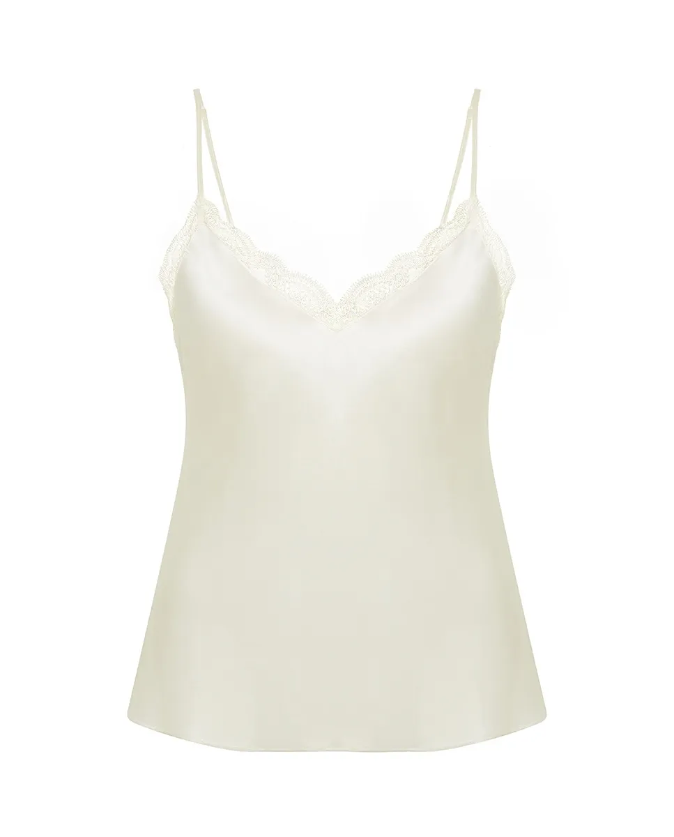 Шелковый топ. Вышивка на вырезе горловины. Слегка расклешенный крой. Регулируемые тонкие шелковые бретели.