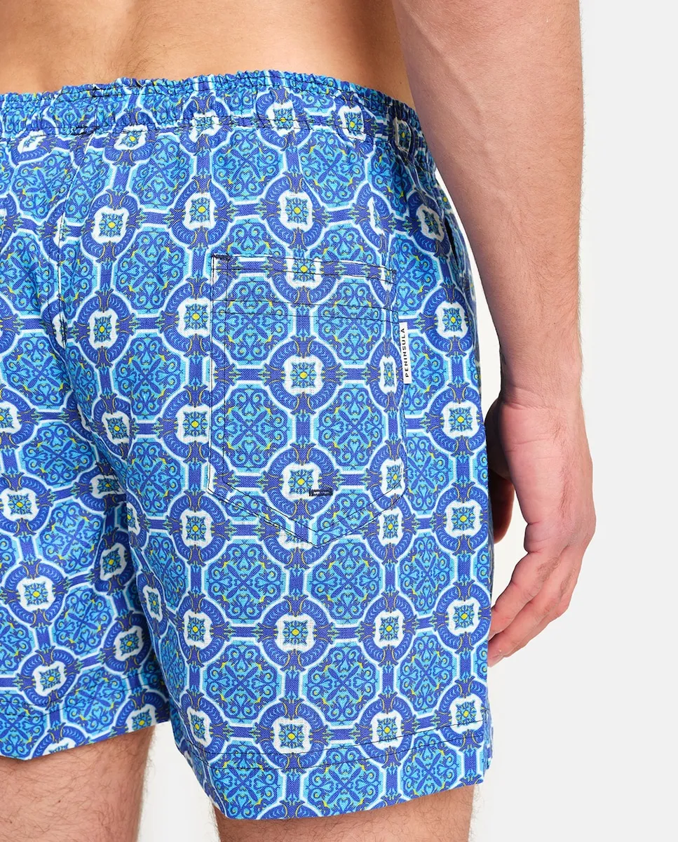 Льняной купальник с принтом в средиземноморском стиле. Два боковых кармана с контрастной внутренней частью и мягкой сетчатой подкладкой. Тщательное внимание к деталям и непреходящая элегантность делают этот продукт уникальным. Сделано вручную в Италии.