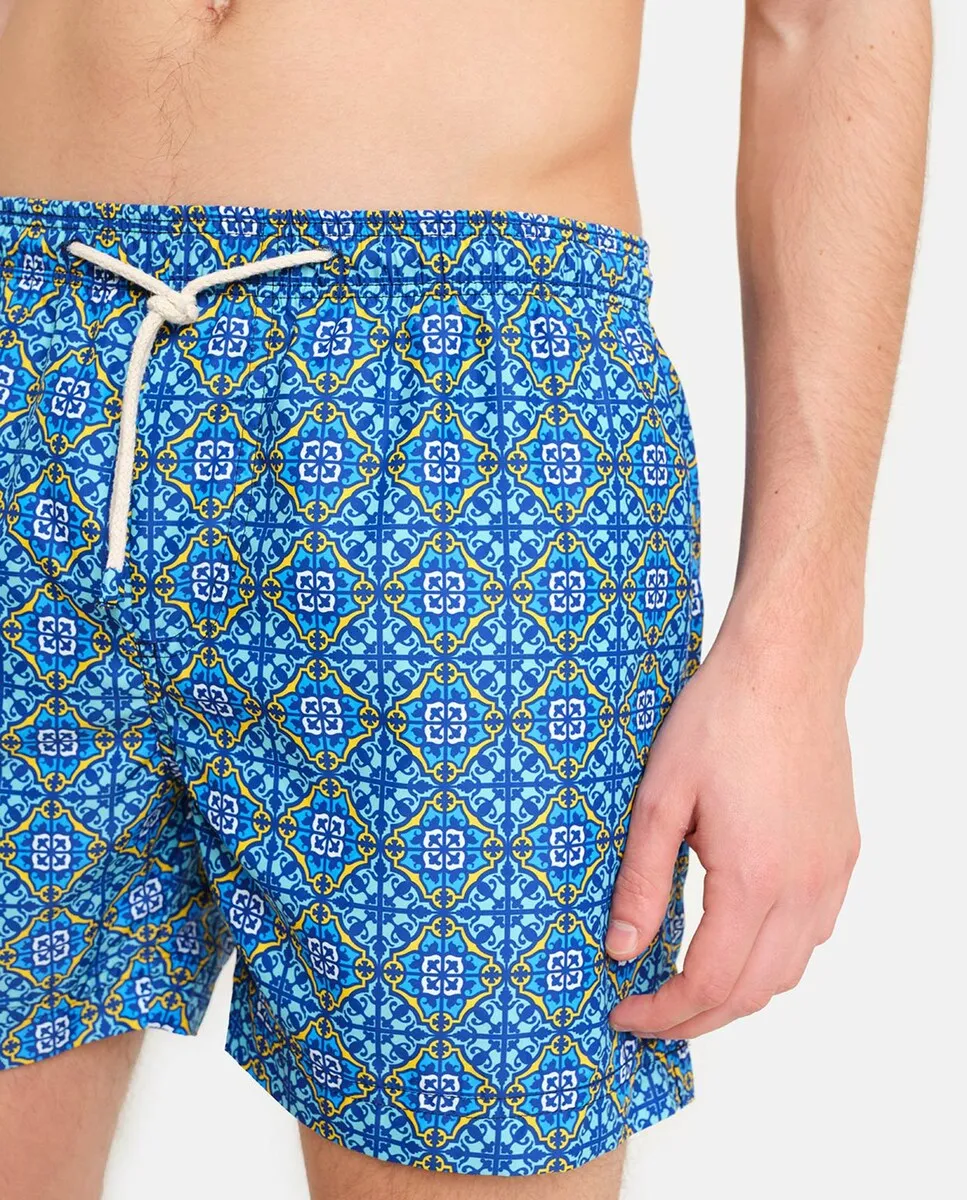 Купальник с принтом в средиземноморском стиле. Два боковых кармана с контрастной внутренней частью и мягкой сетчатой подкладкой. Тщательное внимание к деталям и непреходящая элегантность делают этот продукт уникальным. Сделано вручную в Италии.