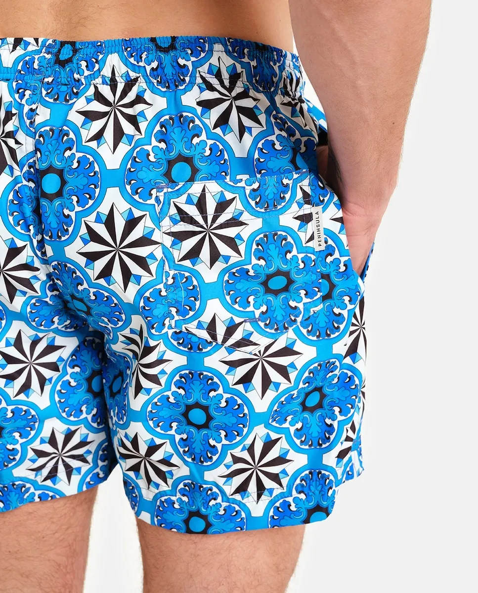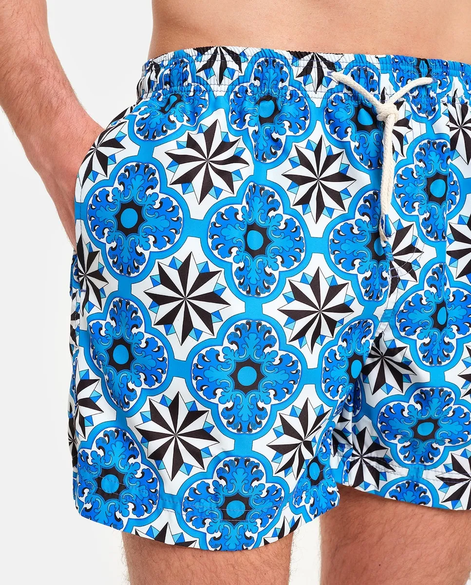 Купальник с принтом в средиземноморском стиле. Два боковых кармана с контрастной внутренней частью и мягкой сетчатой подкладкой. Тщательное внимание к деталям и непреходящая элегантность делают этот продукт уникальным. Сделано вручную в Италии.