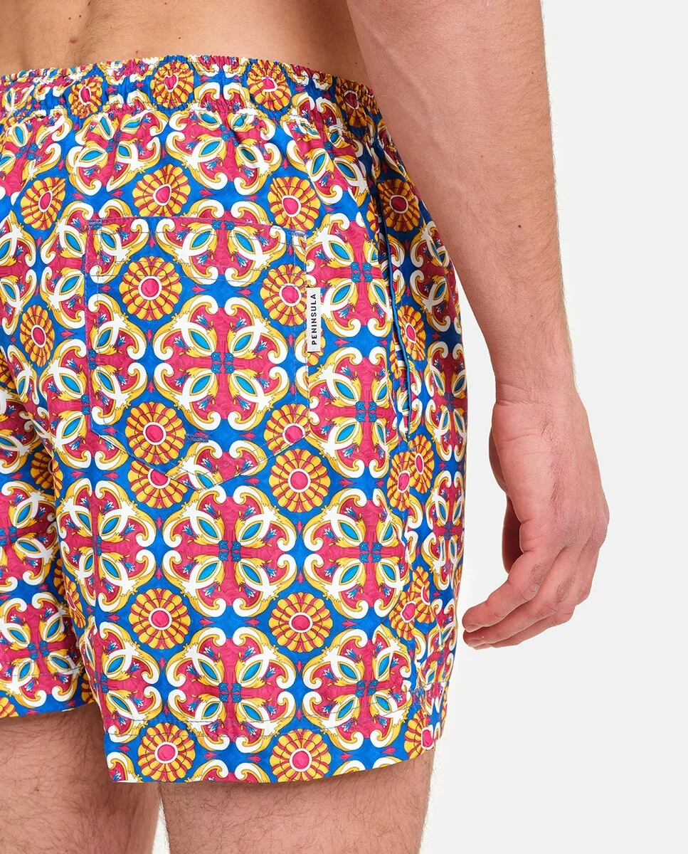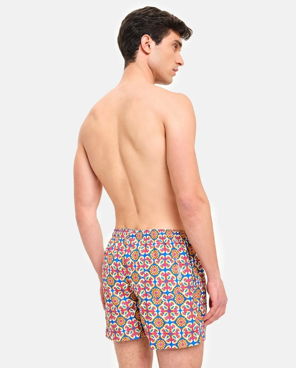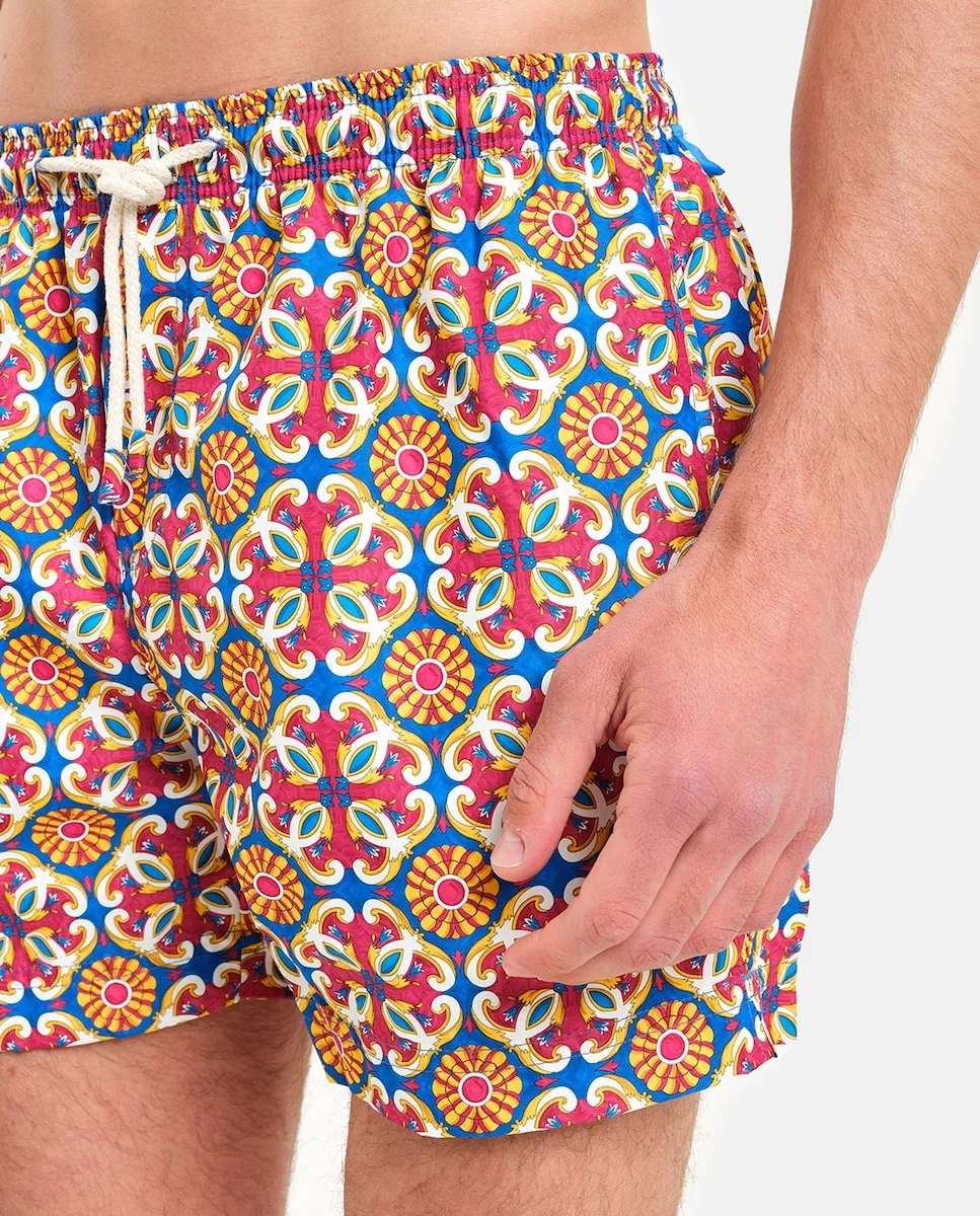 Купальник с принтом в средиземноморском стиле. Два боковых кармана с контрастной внутренней частью и мягкой сетчатой подкладкой. Тщательное внимание к деталям и непреходящая элегантность делают этот продукт уникальным. Сделано вручную в Италии.