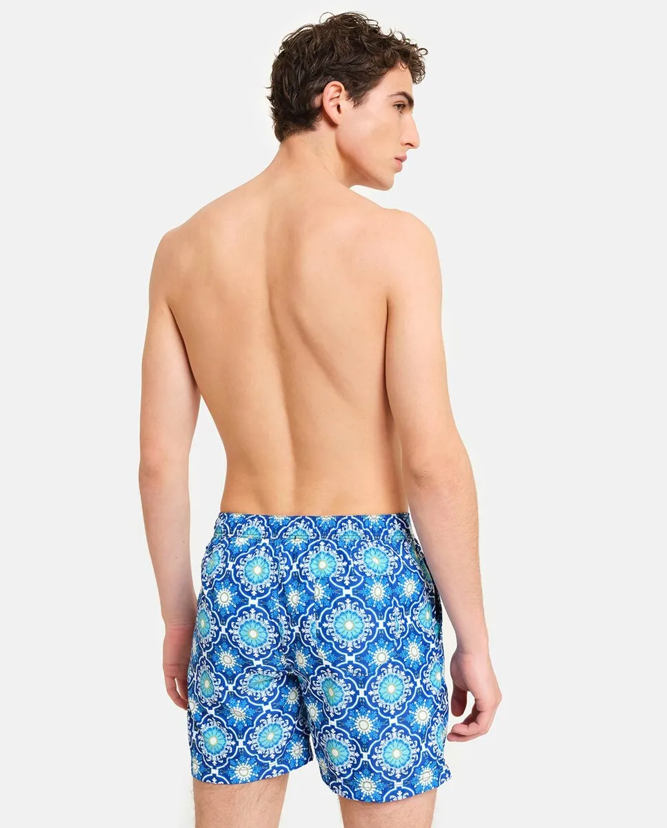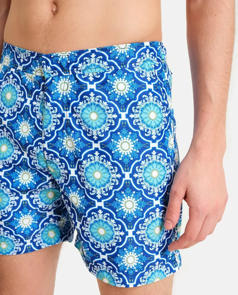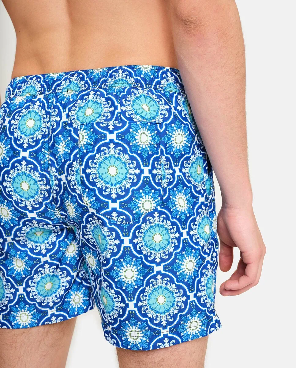 Купальник с принтом в средиземноморском стиле. Два боковых кармана с контрастной внутренней частью и мягкой сетчатой подкладкой. Тщательное внимание к деталям и непреходящая элегантность делают этот продукт уникальным. Сделано вручную в Италии.