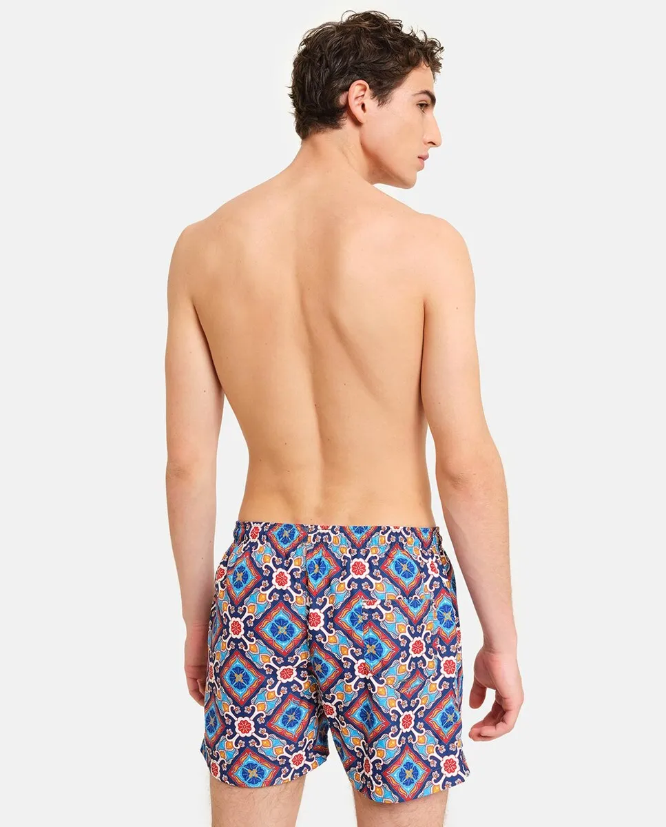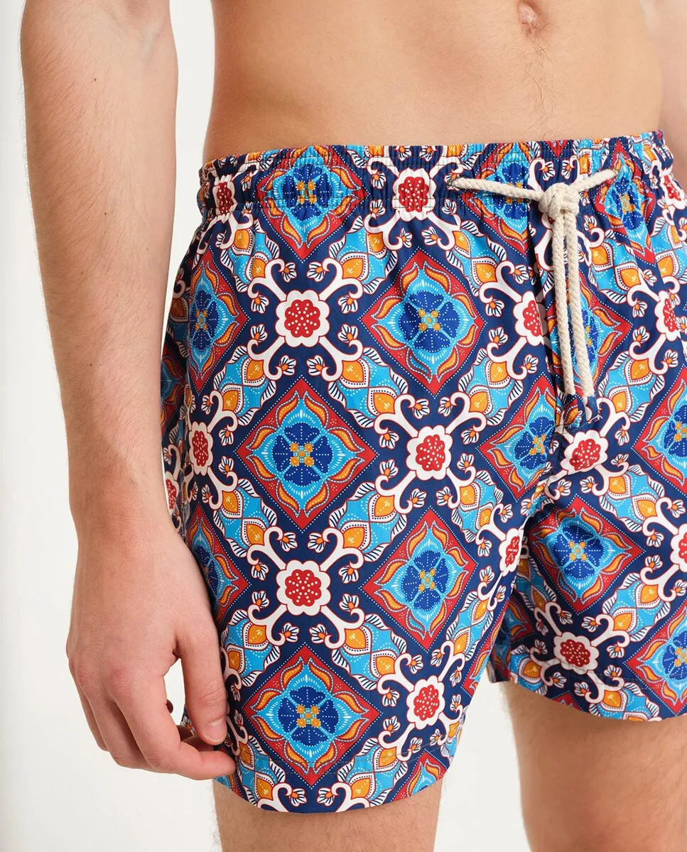 Купальник с принтом в средиземноморском стиле. Два боковых кармана с контрастной внутренней частью и мягкой сетчатой подкладкой. Тщательное внимание к деталям и непреходящая элегантность делают этот продукт уникальным. Сделано вручную в Италии.