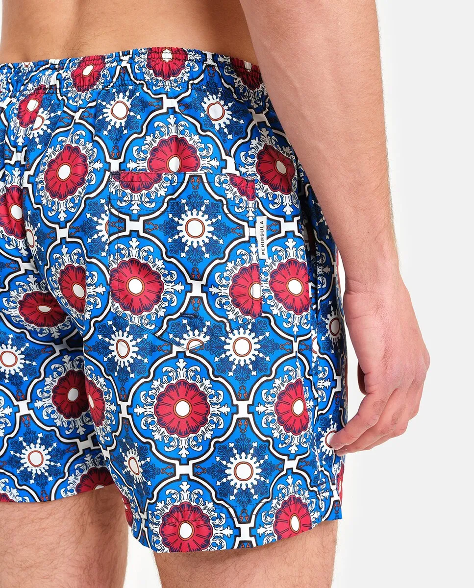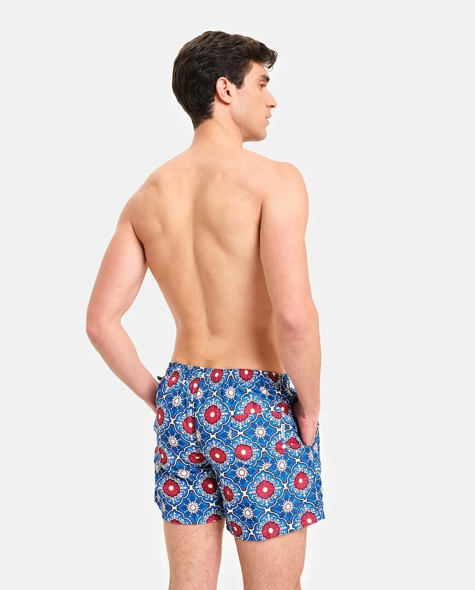 Купальник с принтом в средиземноморском стиле. Два боковых кармана с контрастной внутренней частью и мягкой сетчатой подкладкой. Тщательное внимание к деталям и непреходящая элегантность делают этот продукт уникальным. Сделано вручную в Италии.