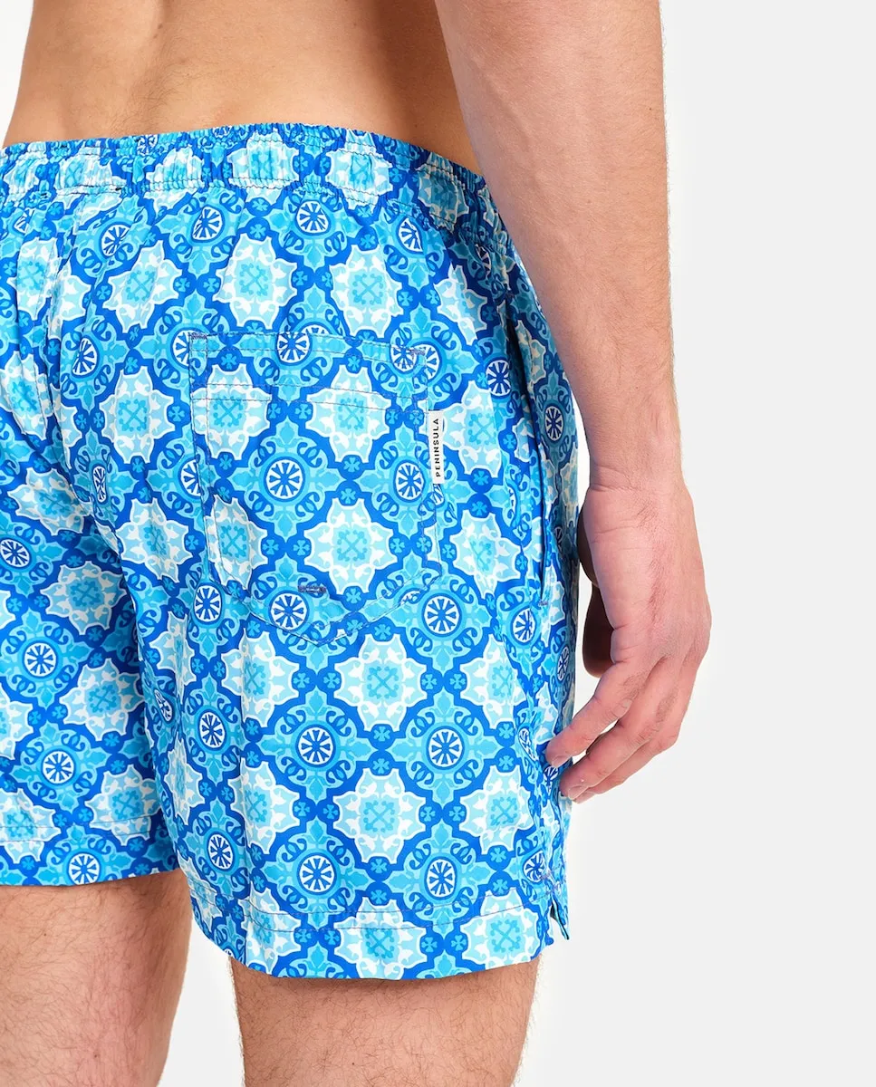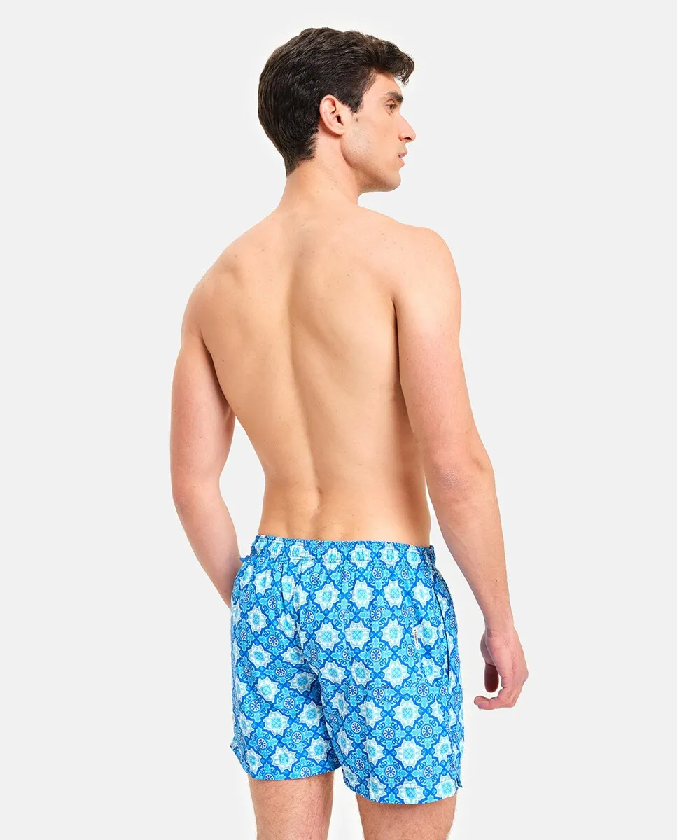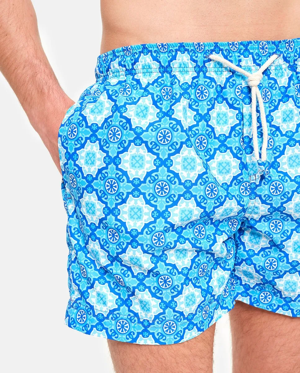 Купальник с принтом в средиземноморском стиле. Два боковых кармана с контрастной внутренней частью и мягкой сетчатой подкладкой. Тщательное внимание к деталям и непреходящая элегантность делают этот продукт уникальным. Сделано вручную в Италии.