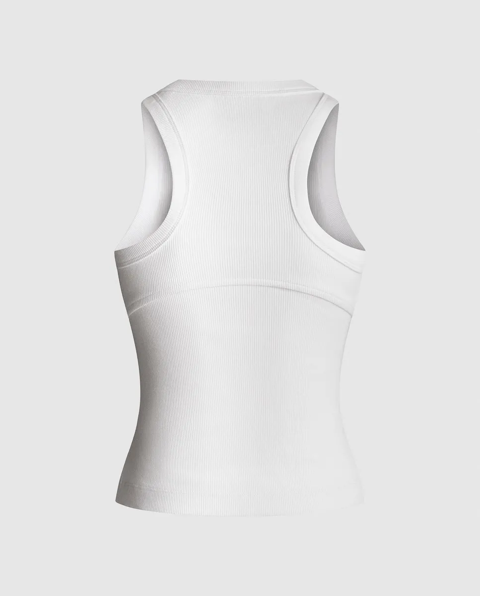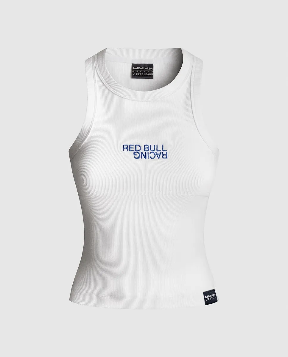 Коллекция Red Bull Racing. Футболка из эластичной рубчатой ткани с круглым вырезом, безрукавками и логотипом Red Bull Racing, напечатанным на груди. Ребристая отделка на горловине и проймах, двойная строчка по подолу и этикетка с логотипом Red Bull Racing, пришитая по подолу.