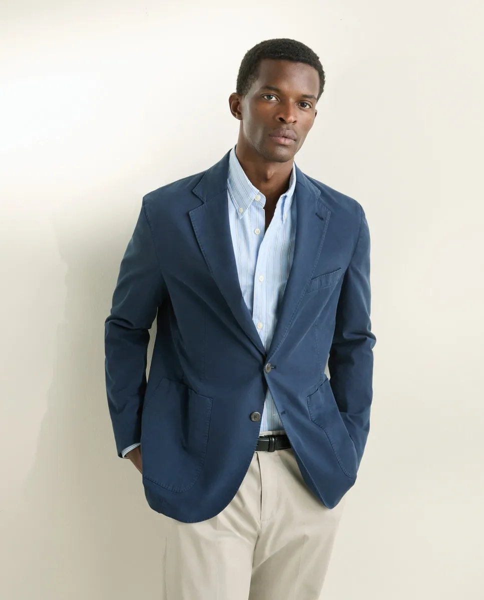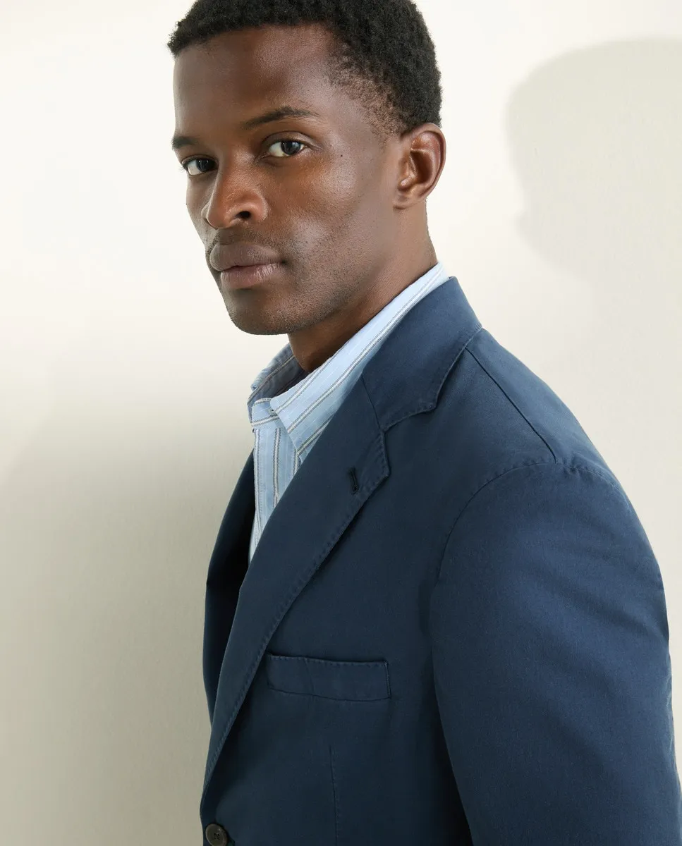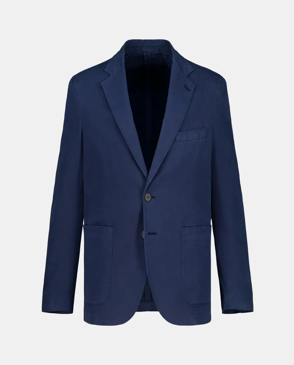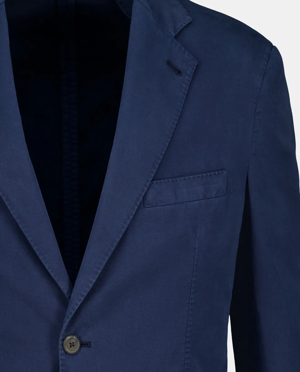 Синяя хлопковая куртка, однорядная, две пуговицы, две шлицы, накладные карманы с нагрудным карманом, без подкладки.