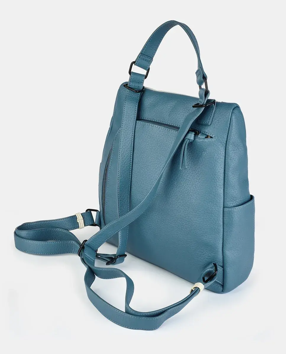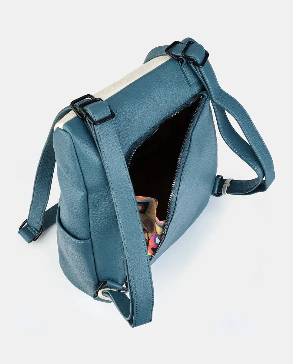 Рюкзак из полиуретана в цвете мульти-деним с застежкой-молнией. Сзади имеется отверстие и внутренний карман на молнии. Два длинных регулируемых плечевых ремня