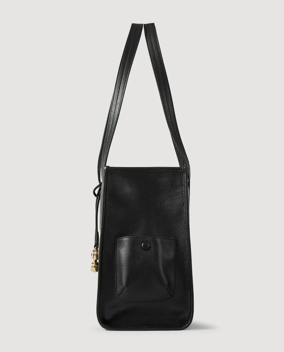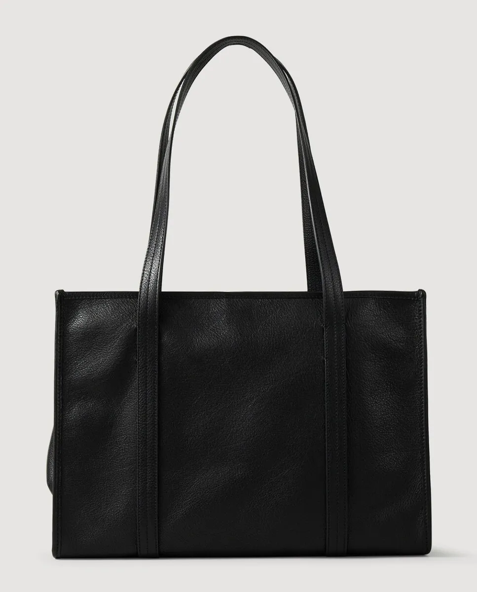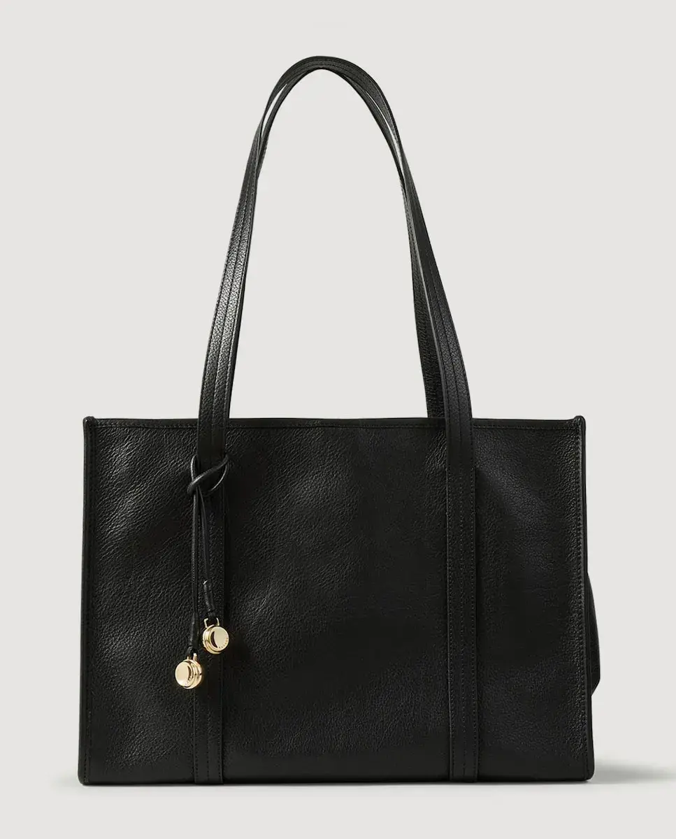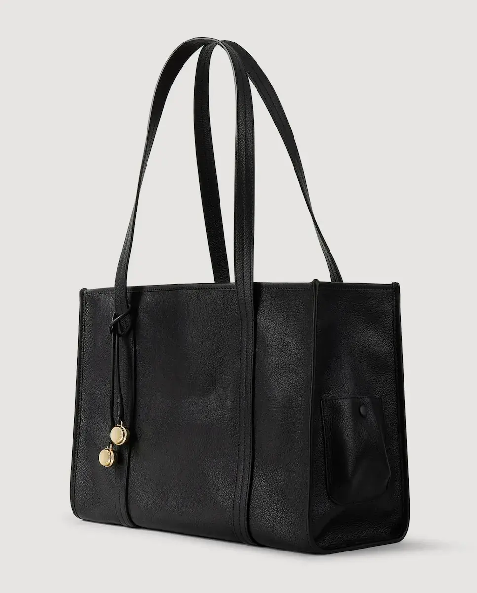 Мягкая кожаная сумка-тоут с длинными плечевыми ремнями, магнитной застежкой, боковым карманом и подвеской. Женская гибкая кожаная сумка-тоут Sandro. Длинные ручки: 29 см. Магнитная застежка. Амулеты. Боковой карман. Размеры: 37,5 х 26 х 16 см.