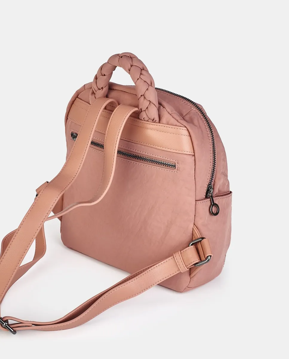 Рюкзак из нейлона и полиуретана телесного цвета с застежкой-молнией. Задний и внутренний карманы на молнии. Две длинные регулируемые ручки.